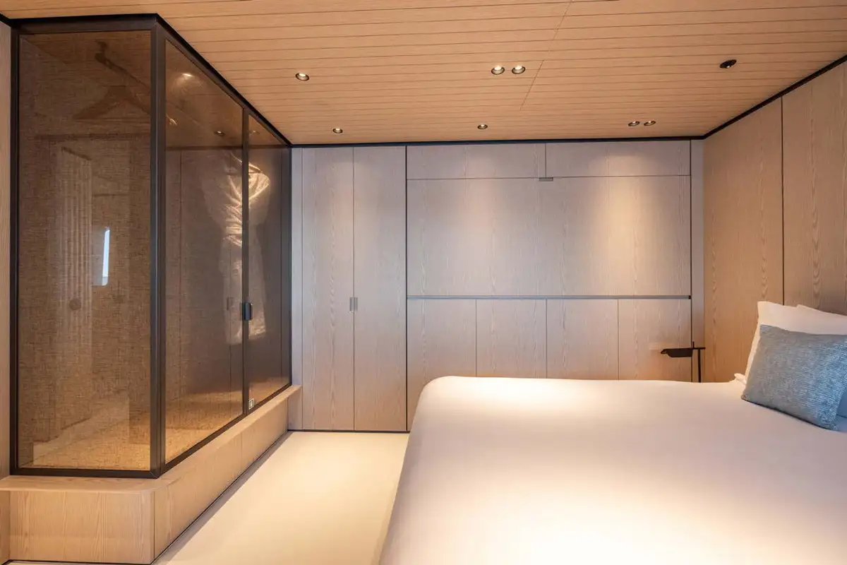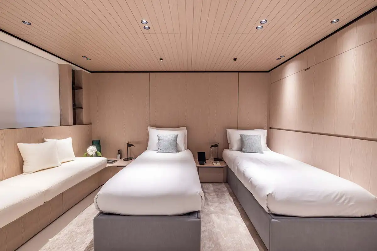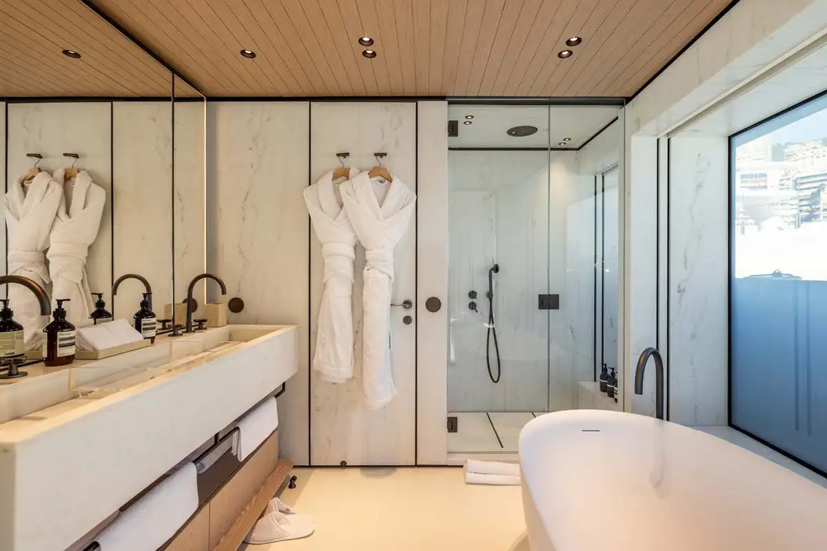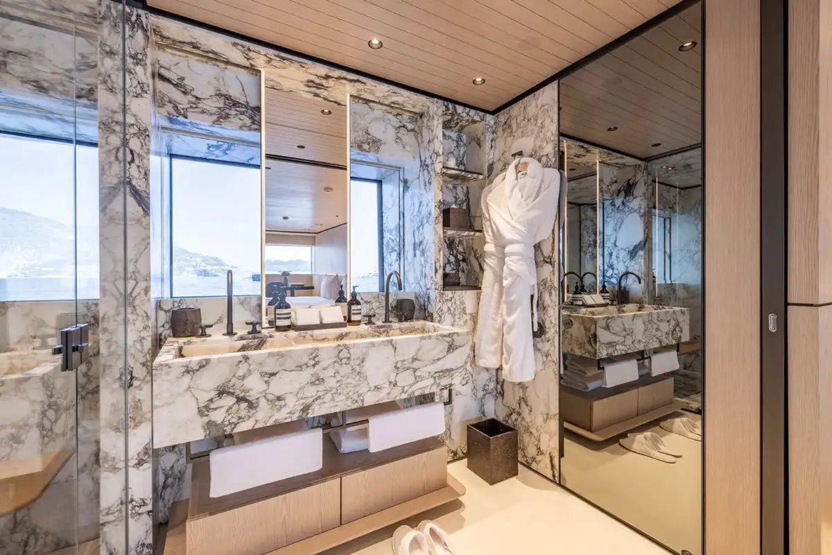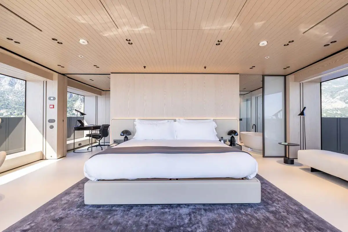 Up front on the main deck is a second full-beam master suite with a separate anteroom that serves as both a dressing room and a treatment room with a massage table. This leads into the main cabin where there’s a study and armchair on the starboard side of the king size bed and a large en suite bathroom to port. The other four guest cabins are two VIP doubles and stop twins, one of which is designed for servants or staff.