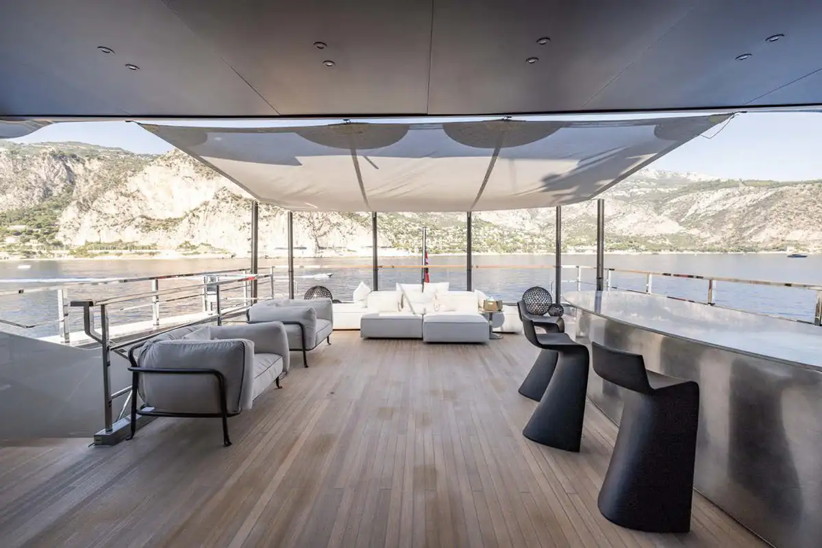 The upper deck master suite includes a separate study and dressing room as well as a spectacular main cabin with a large en suite bathroom and commanding views on three sides. On the bow, past the suite’s private foredeck lounge, there’s a wide expanse of deck where a helicopter can land.