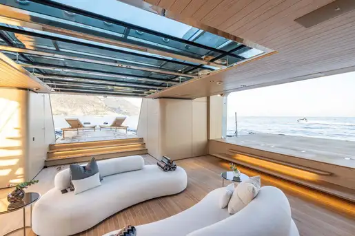 Other onboard highlights include the glass-bottom swimming pool on the main deck aft, surrounded by great swathes of sunpads, and the large square jacuzzi pool on the foredeck – part of the master cabin’s private open-air lounge – with its sweeping, elevated views of the seascape. The bridgedeck aft is an outdoor party zone with a DJ booth and a massive mirror TV; there’s also a panoramic seating area in a Portuguese bridge and the upper aft deck has a superb outdoor dining area as well as a sunbathing space, so every member of a large, diverse group of guests will find a place on board that perfectly suits their mood.