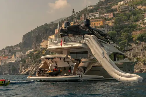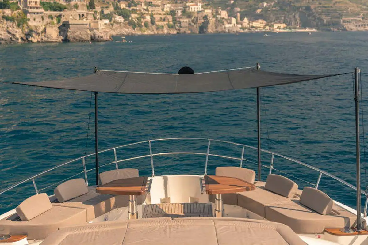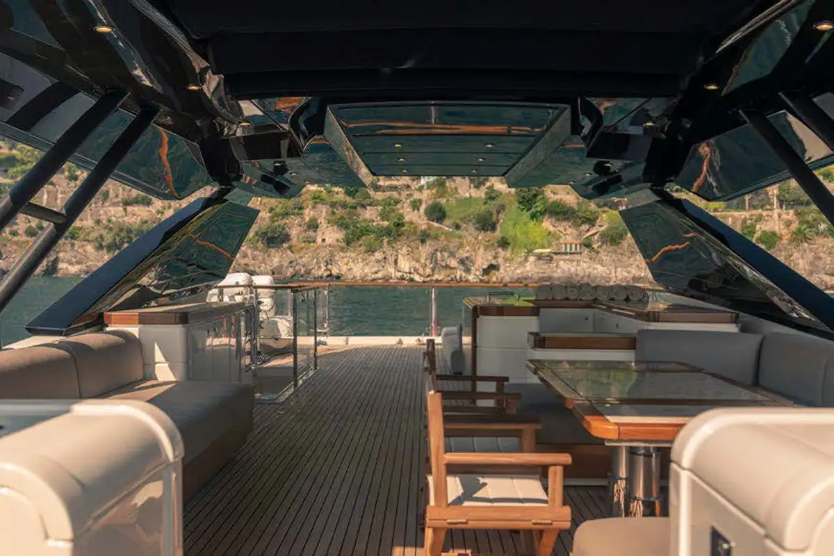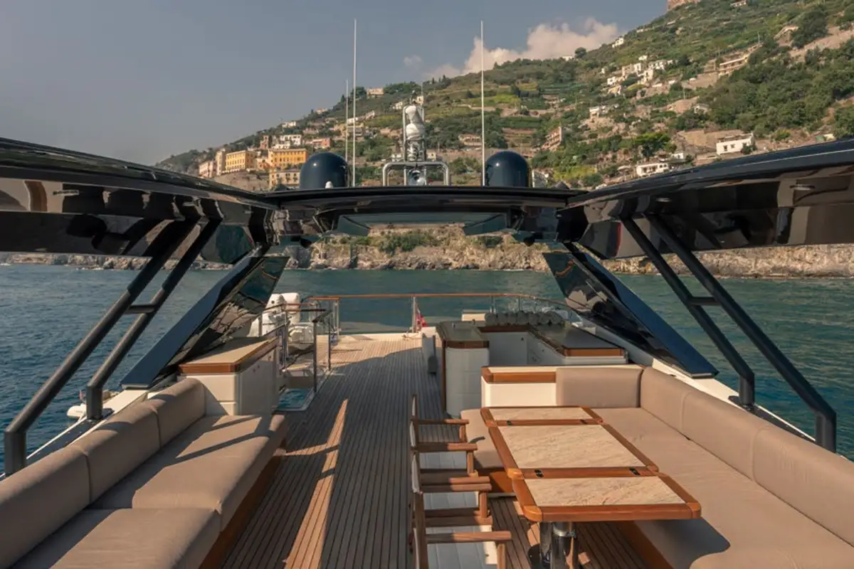 From alfresco dining to lounging in the sun, guests will enjoy VIVALDI's comfortable outdoor spaces. The main deck aft features a lounge with a built-in sofa and chairs accommodating up to 12 Guests around the table. From here, guests can make their way to the swim platform that directly accesses the water — it is the perfect spot for launching water toys, swimming and sunning. Sunpads on the foredeck are a wonderful place to enjoy the views. The flybridge features an automatic folding roof to provide shade if desired where up to 10 Guests can sit around the table.