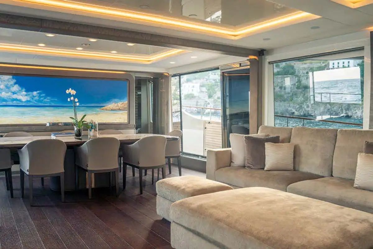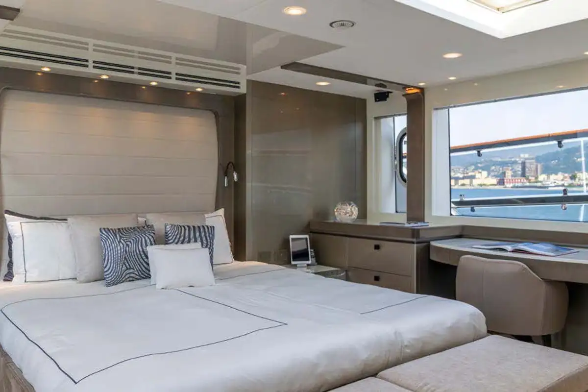 The interior of VIVALDI was designed by Nuvolari Lenard. The yacht's large windows provide ample natural light to highlight the yacht’s soft earthy color palette and provide views of the destination while guests are enjoying the indoor spaces. The main deck is an excellent place to relax after a day on the water. Forward, a formal dining table welcomes eight guests. The master stateroom is located on the main deck; it has a private, lounge-like feel and benefits from all-day sunlight courtesy of a skylight and ample windows. Four additional guest cabins, including two VIPs and two twins, are beautifully decorated and located below deck. All staterooms feature en-suite facilities.