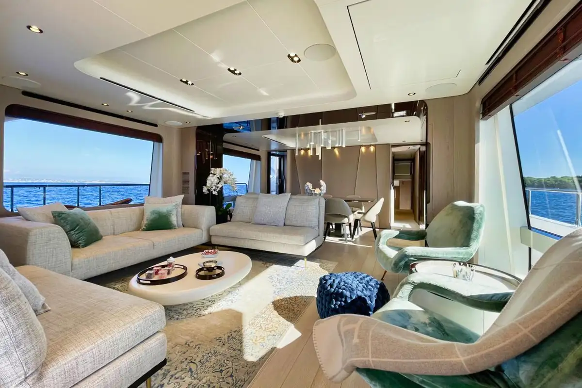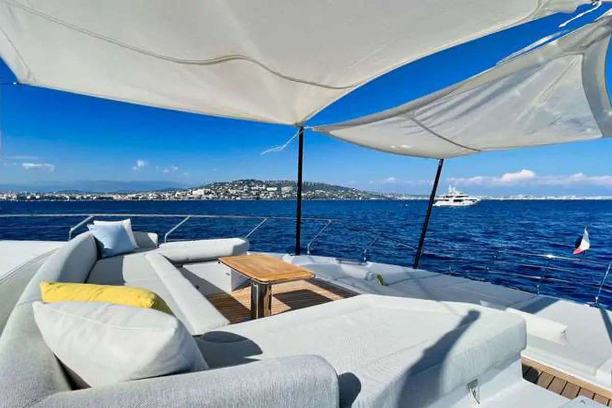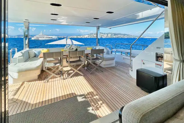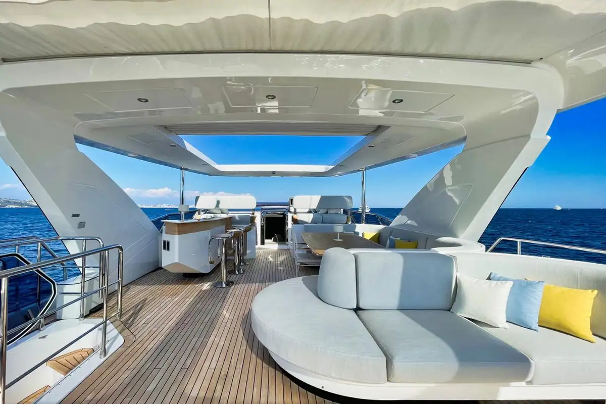 Outdoors, life flows between spacious decks made for soaking up the sun or socialising in style – think a shaded foredeck lounge, an al fresco dining area on the main deck aft, and a flybridge with sprawling seating complete with a bar made for sundowners.