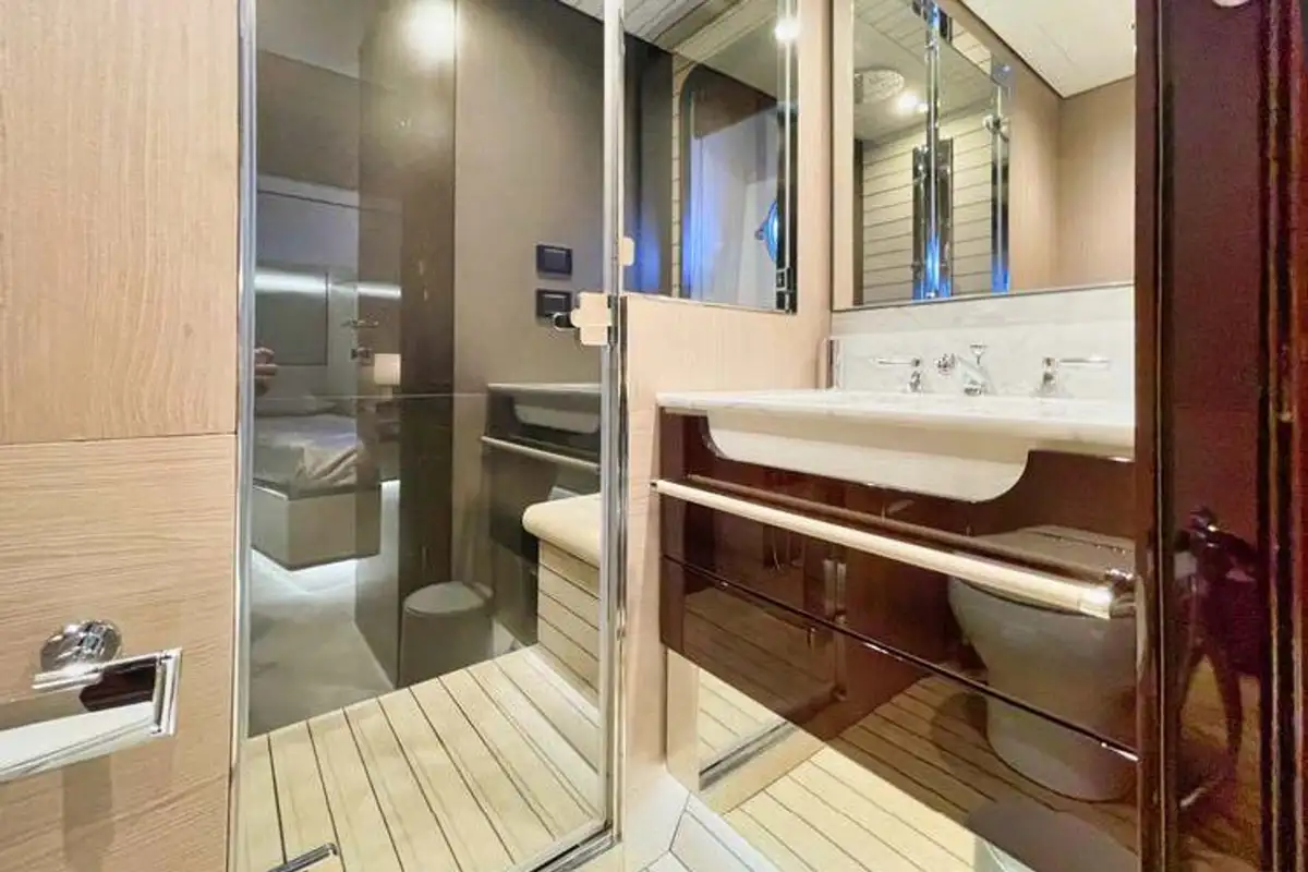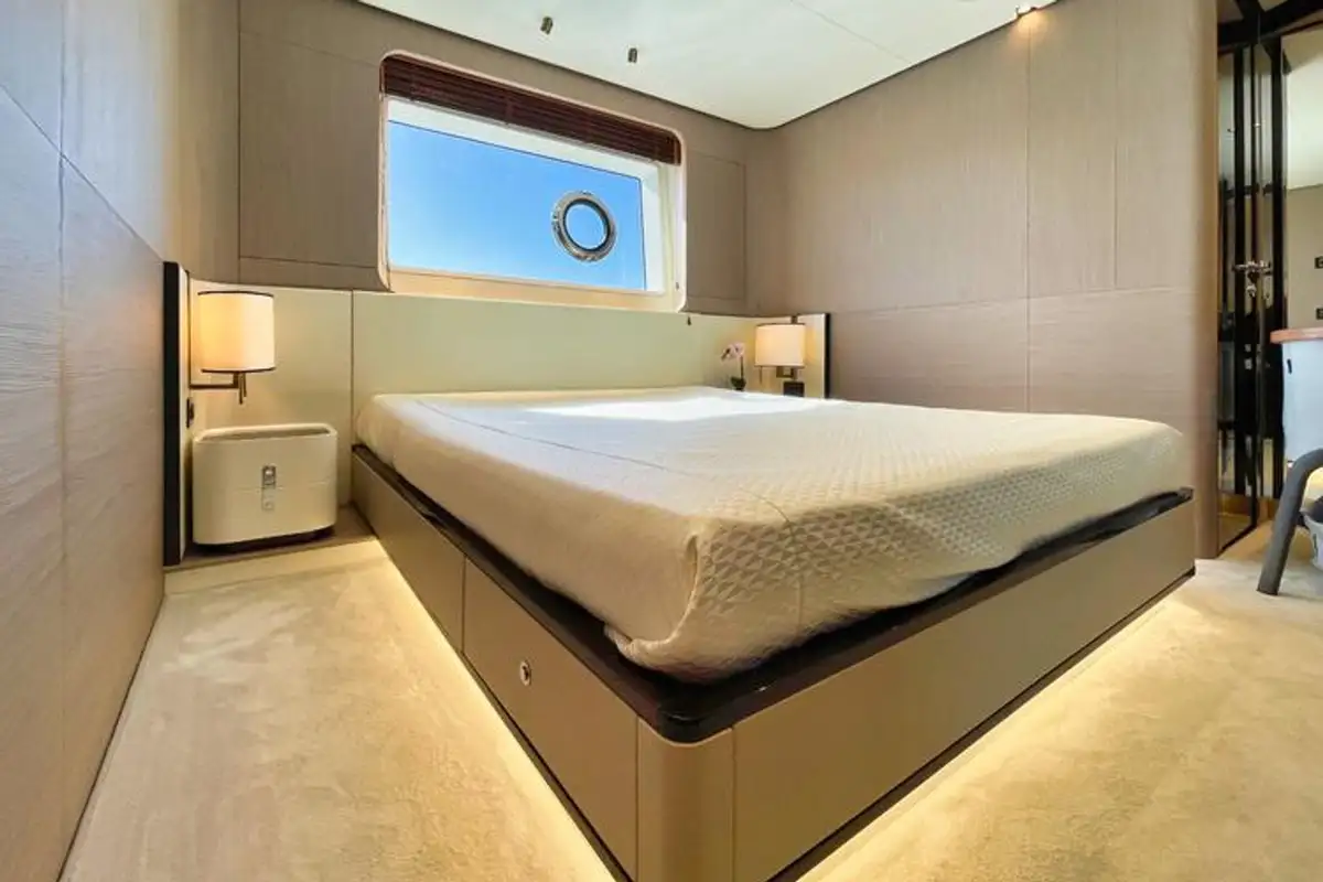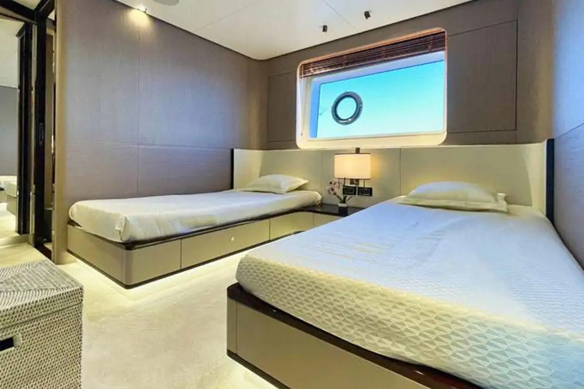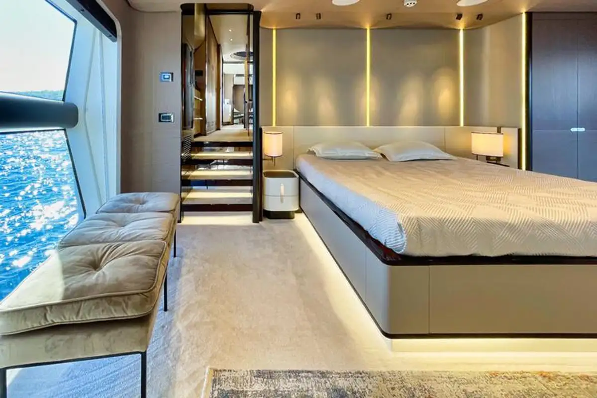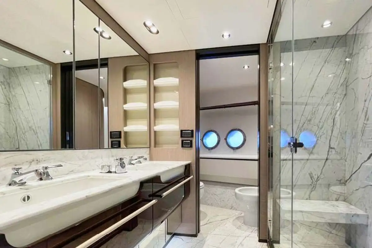 WAVE accommodates up to 10 guests across five cabins. Principal among these is the master cabin, located forward on the main deck. The remaining cabins can be found on the lower deck, formed of two VIP cabins and two twins, offering flexible accommodation for families or groups of friends.
