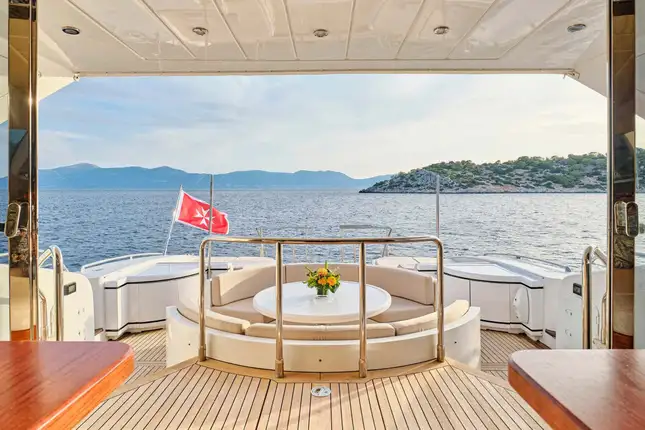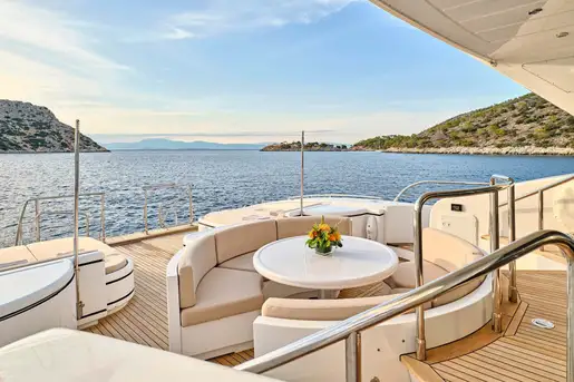 Step out of the skylounge through the full-beam glass doors and you’re onto the mezzanine aft deck. There’s a snug, sociable eight-seat dining table and a open transom with double sun beds below and beyond. You’re only a few steps from the water down here, so when you fancy a cooling dip you can simply dive straight in.