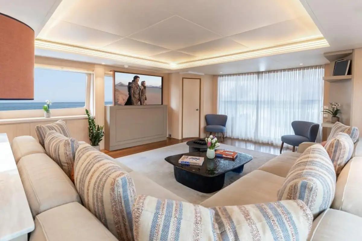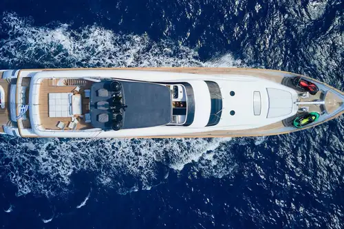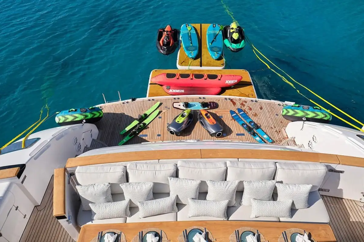 Descending to the main deck, there is a vast forward sunpad, while aft you’ll find the second al fresco dining area in the cockpit. Staircases to the rear lead to the broad swim platform and the departure point of a host of water sports activities. With two jetskis, SeaBobs, SUPs and a multitude of towable toys available (including decks, doughnuts, skis and wakeboards) there’s plenty to keep all of your party occupied, no matter their age or ability.