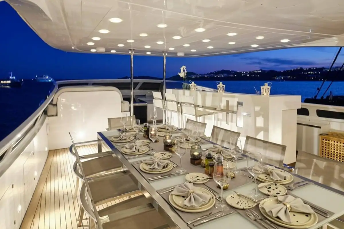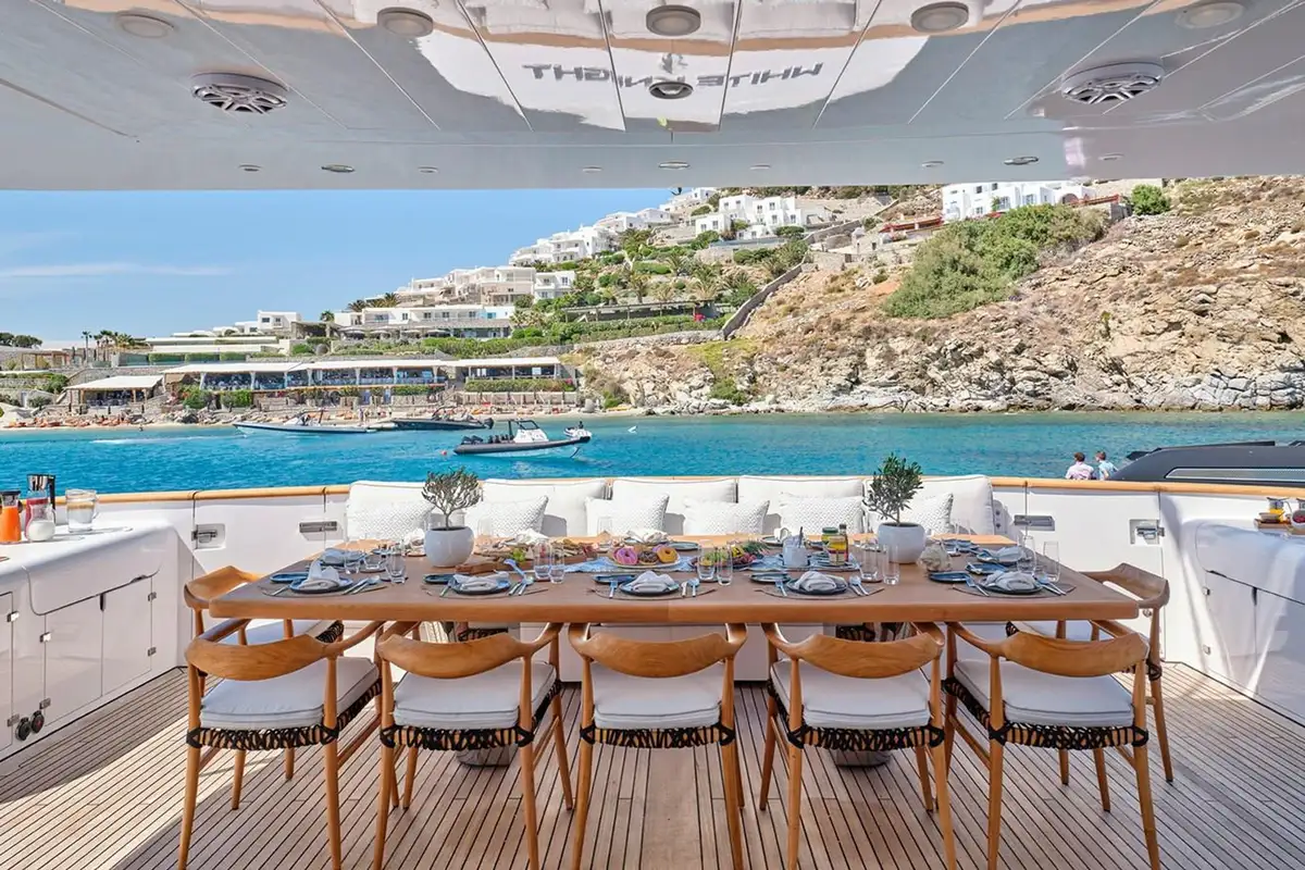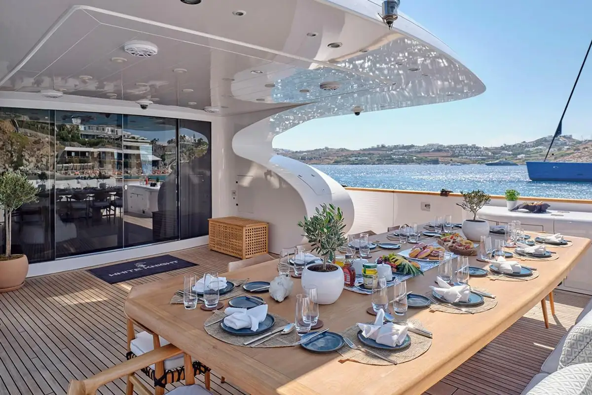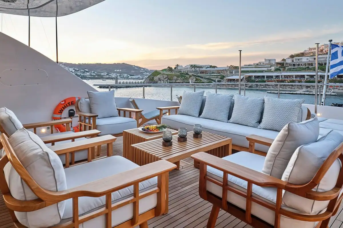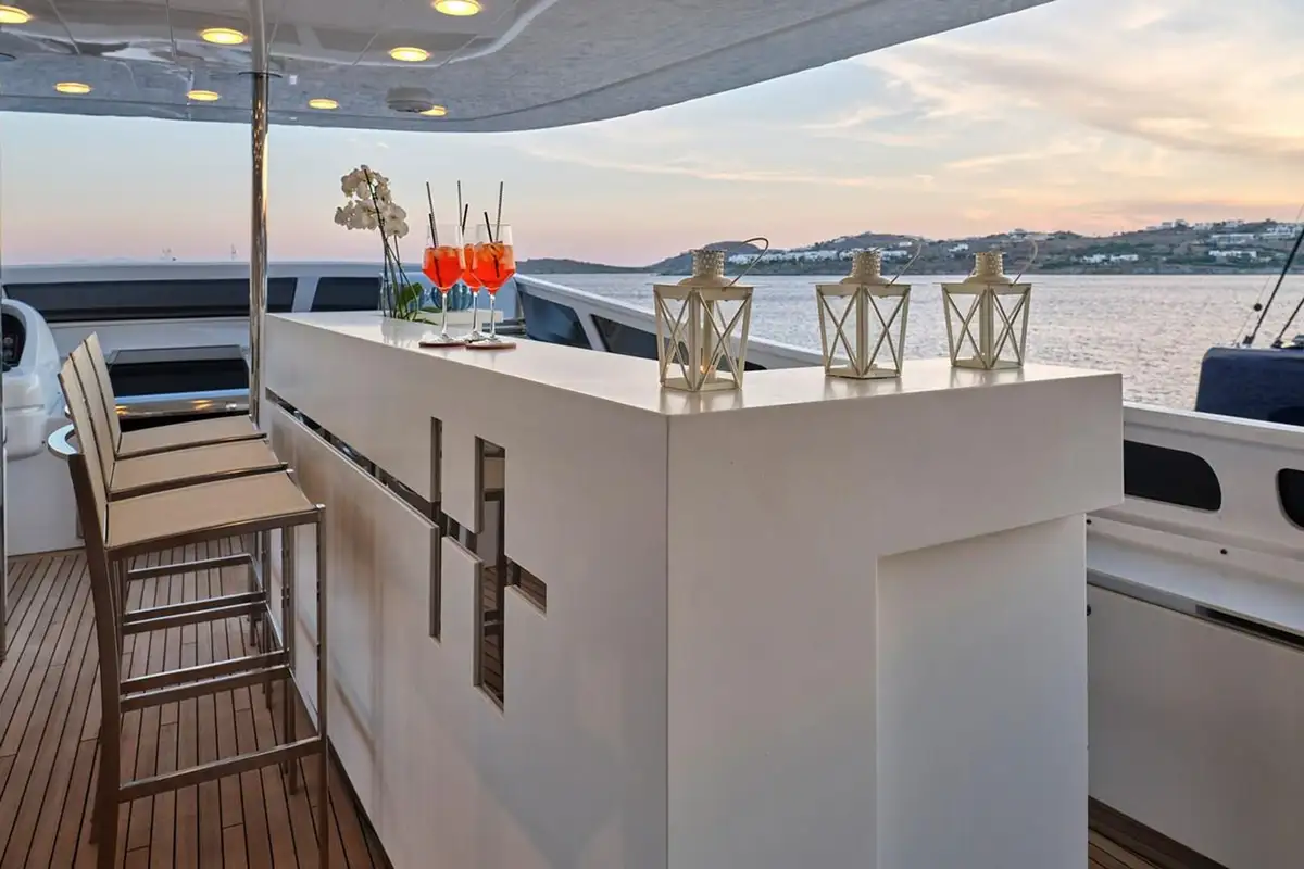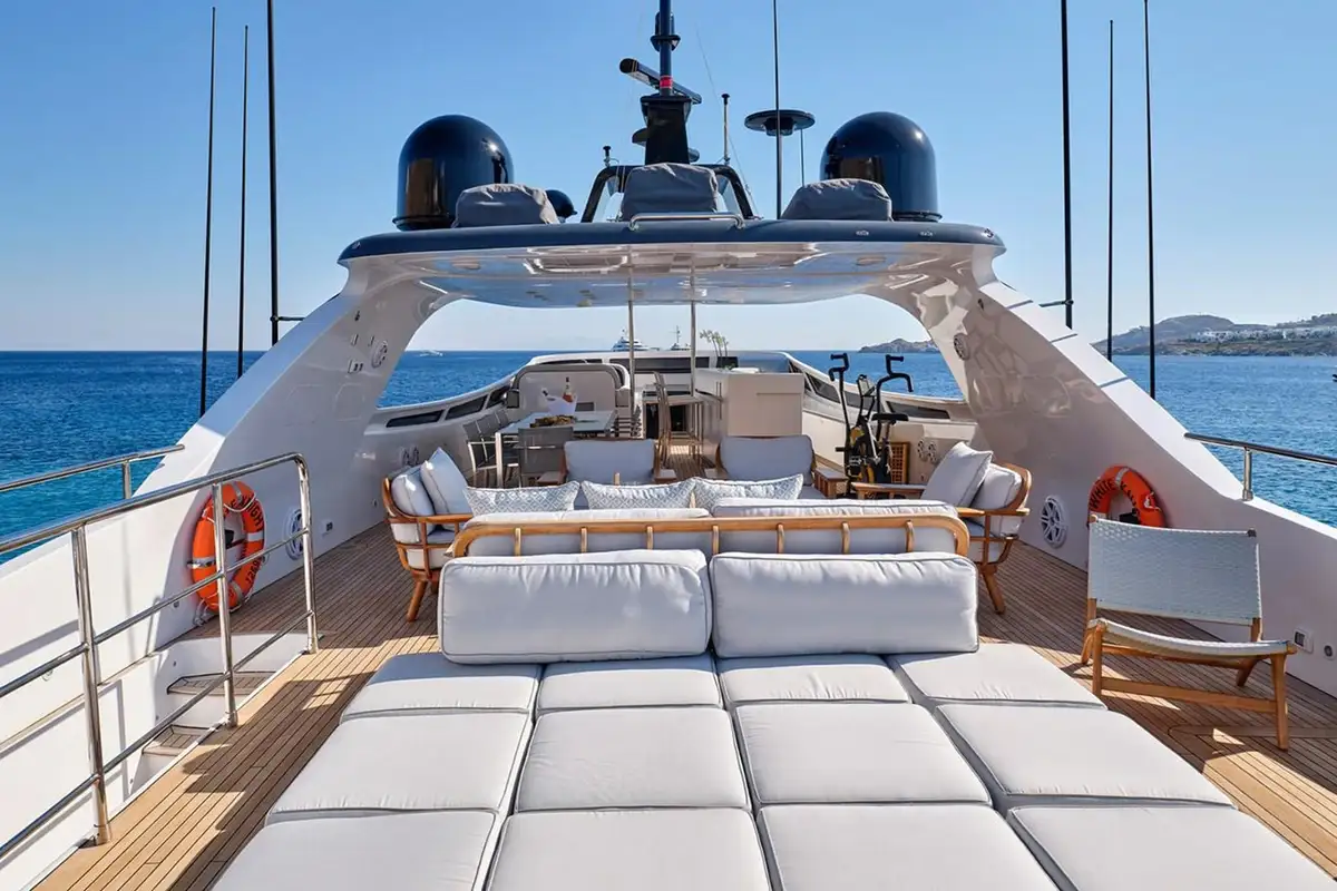 Throughout WHITE KNIGHT her light wood finish is complimented by a clean and fuss-free style, creating a bright contemporary environment in which to entertain or relax. On deck, WHITE KNIGHT is no less impressive. She features a long sun deck complimented by one of two al fresco dining areas, a wet bar, a shaded al fresco lounge, and an expansive aft sunpad for your entertainment. For the more active guests, there is also an air bike.