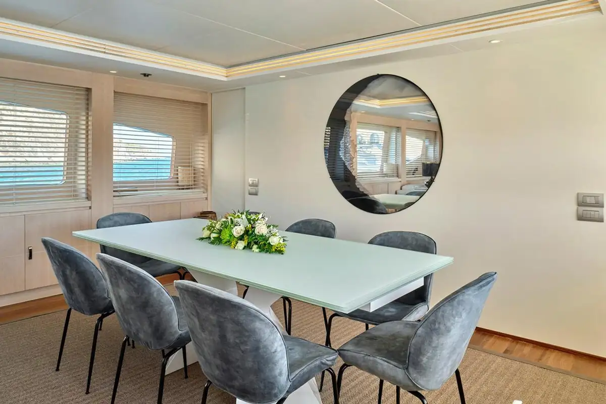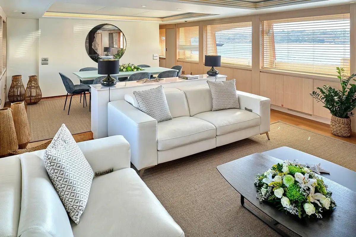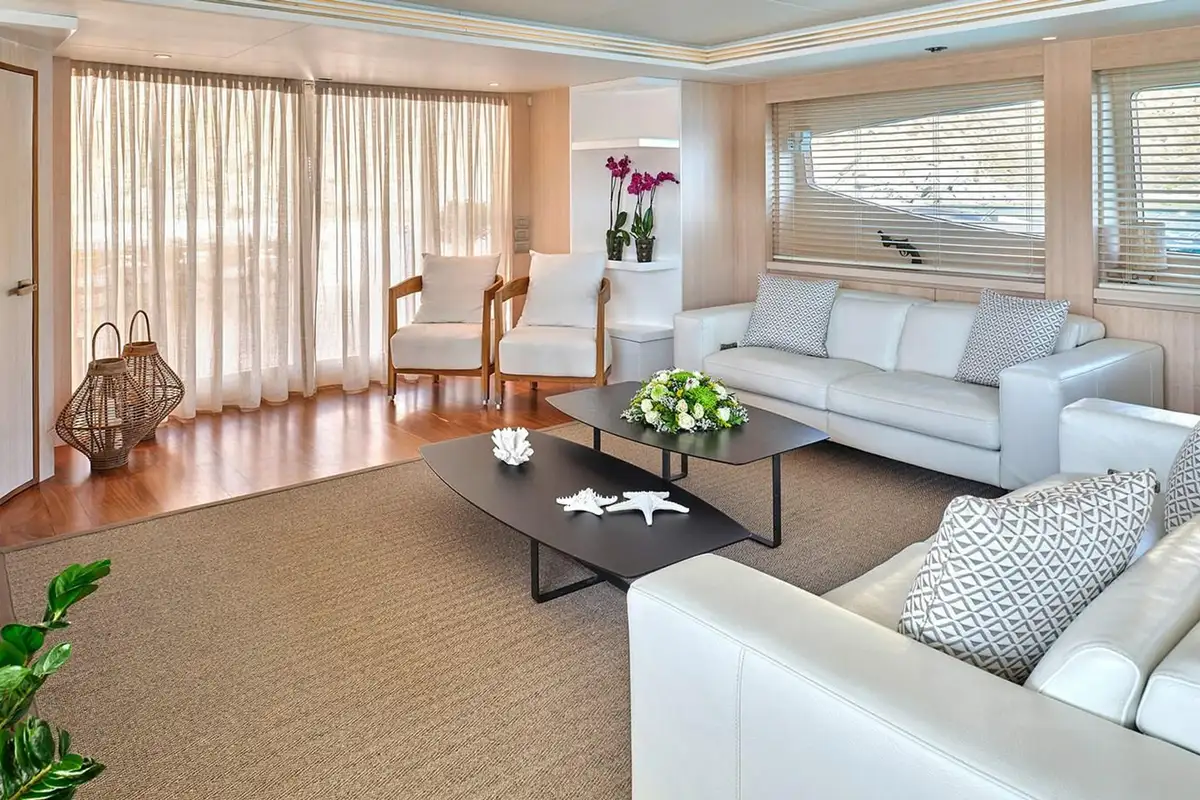 There’s a third dining area in the main saloon. This beautiful light and harmonious area can set the scene for buffets or banquets. Large picture windows run the length of the saloon so you’re never short of a view to admire while enjoying the culinary creations of WHITE NIGHT’s chef. White leather sofas in the lounge area, make a relaxed area to watch sports or movies on the rise-up TV or just chill with a book and a drink.