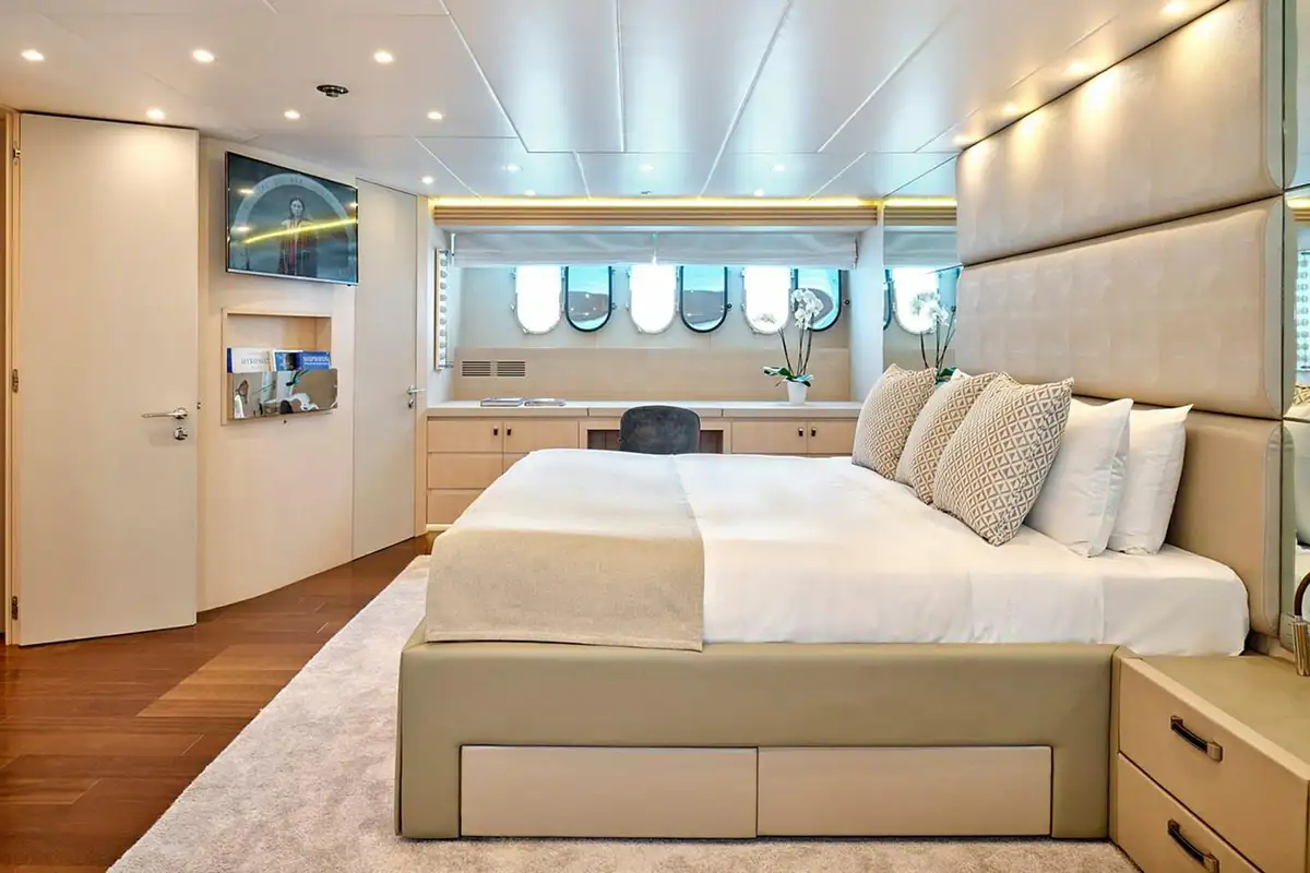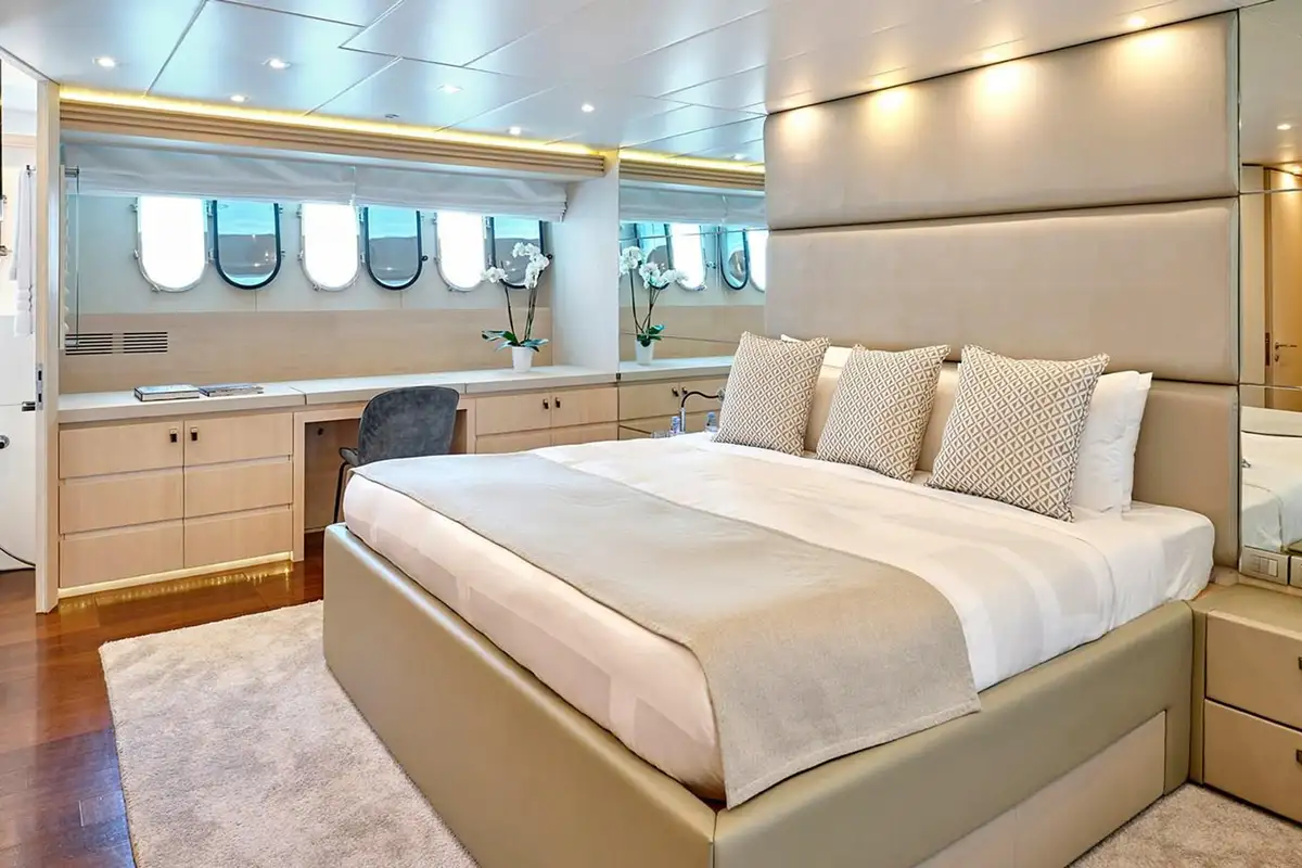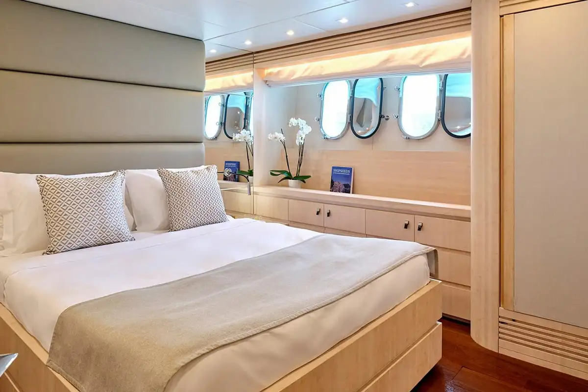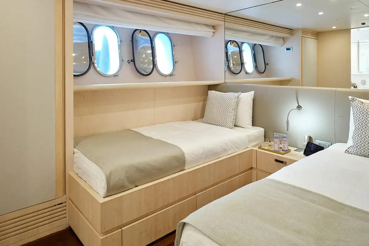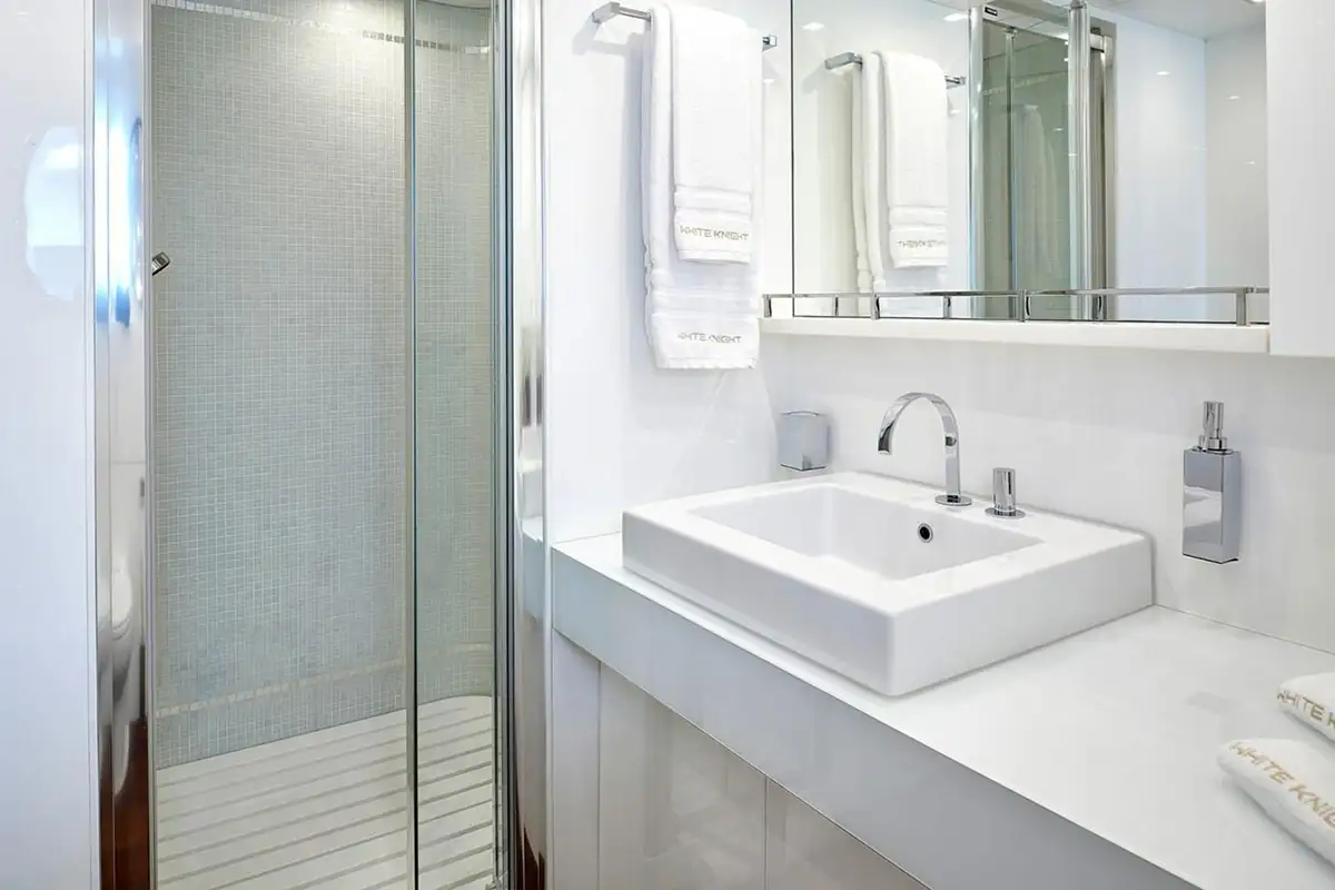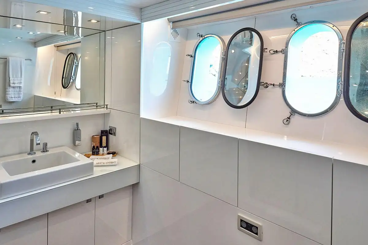 WHITE NIGHT’s full-beam master suite is a beautiful sanctuary to retreat to. Located on the lower deck, with hull windows on both sides, it’s a wonderful space to de-stress and unwind. The suite is furnished with a sofa to starboard, a desk to port, and a central king-sized berth. To the rear, there’s a walk-in wardrobe and an en suite bathroom. For your special guests, there’s a main deck double VIP suite. Like the rest of the yacht, the light wood theme continues here. To port is an L-shaped sofa while to starboard is a desk. The remaining guest accommodation is to be found on the lower deck with two double suites, and two twin-berth suites – with extra pullman berths.