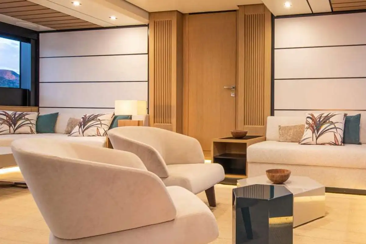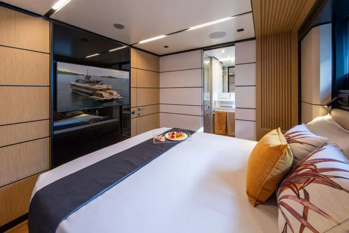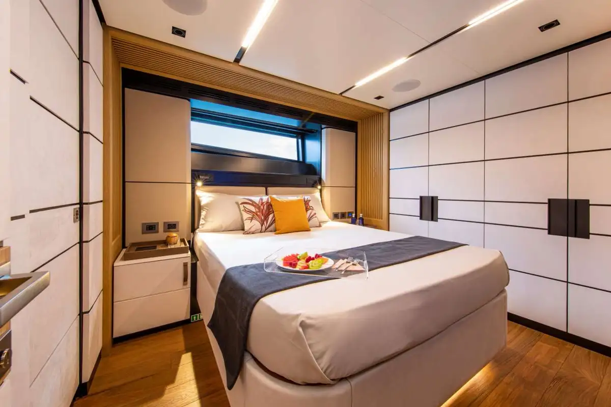 Below deck, three spacious double cabins provide stylish retreats for guests, each bathed in natural light and finished with meticulous attention to detail.