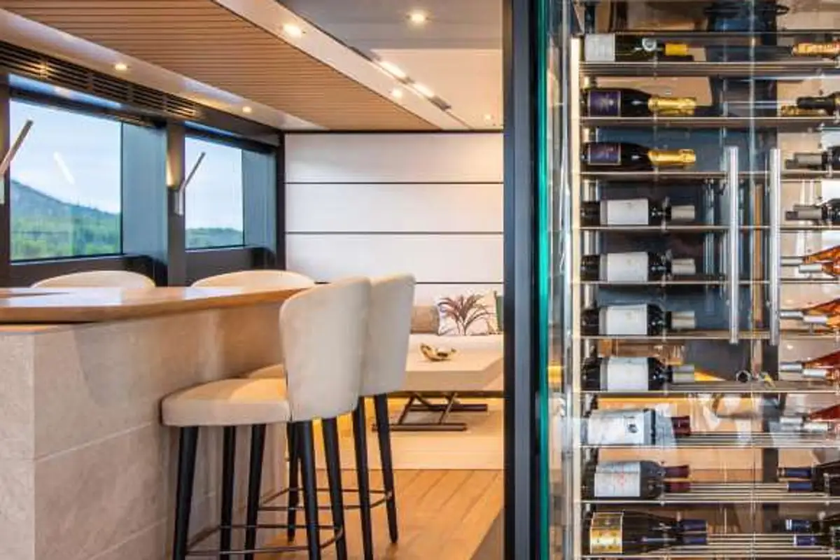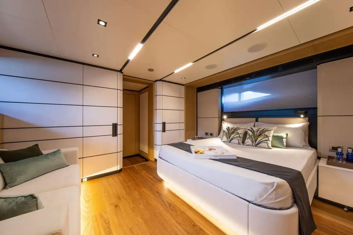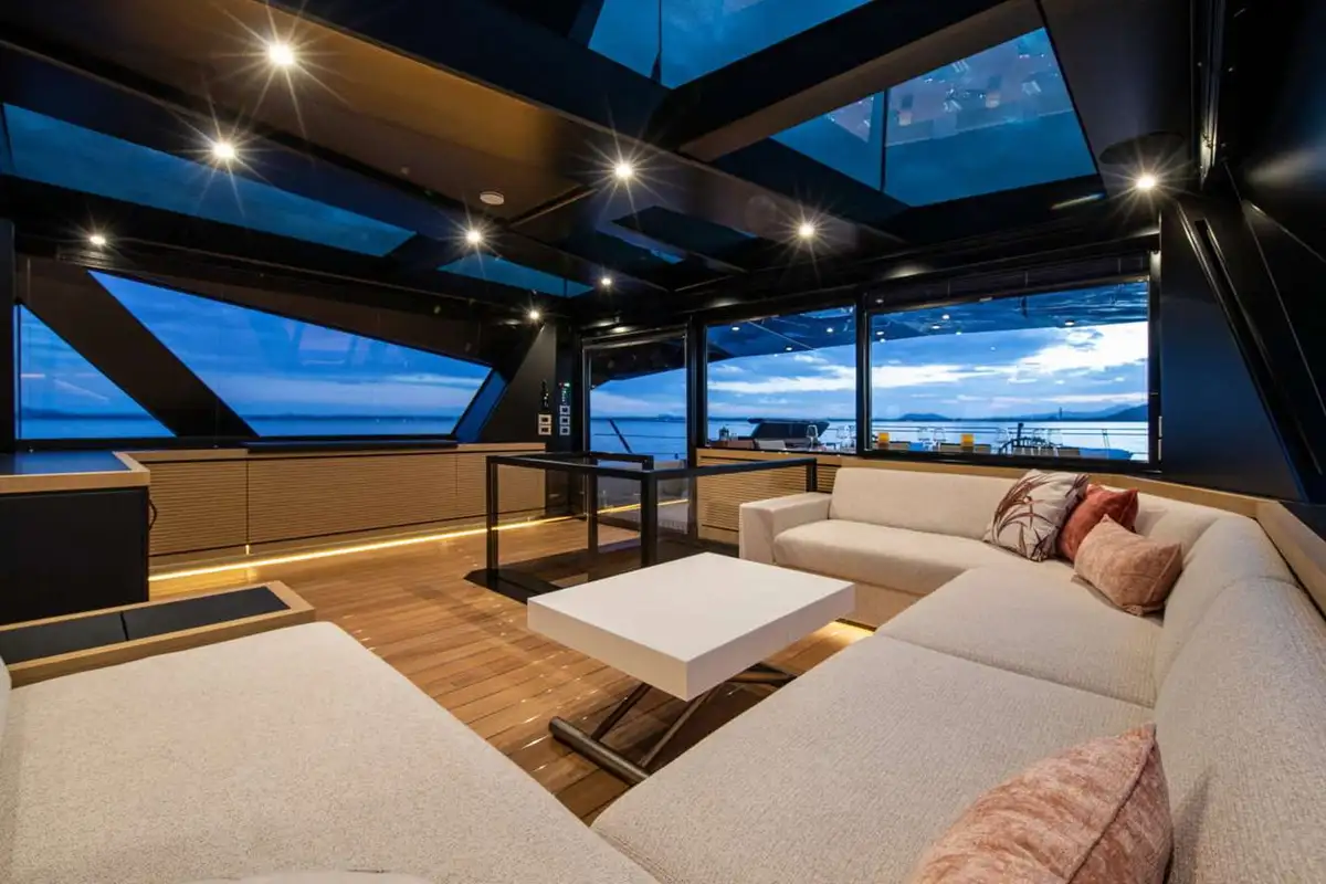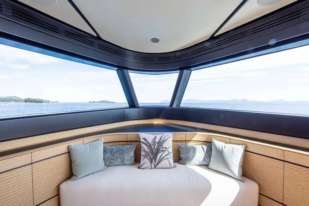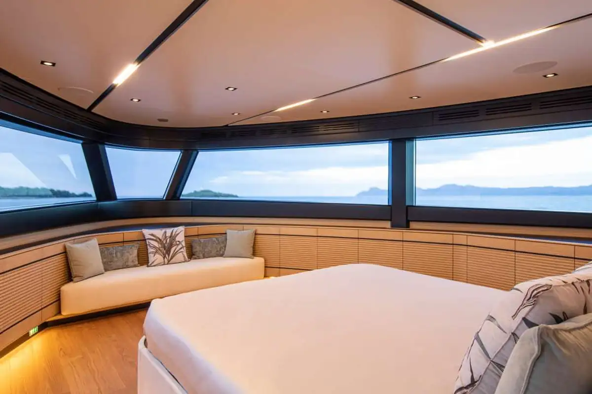 Accommodating up to eight guests in four beautifully appointed cabins, her standout feature is the spectacular master cabin on the main deck. With wraparound windows, this serene stateroom offers 180-degree panoramic views that shift with every horizon.