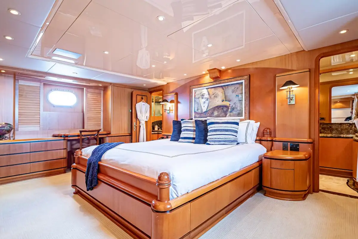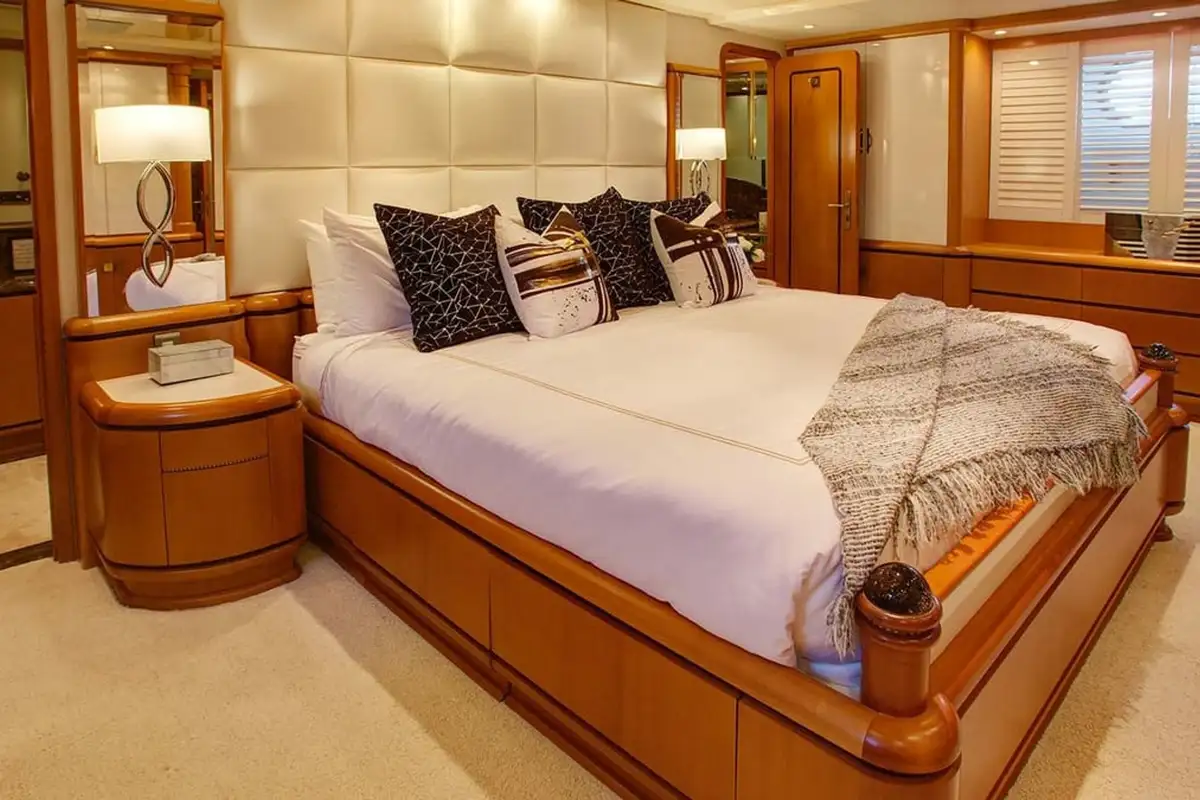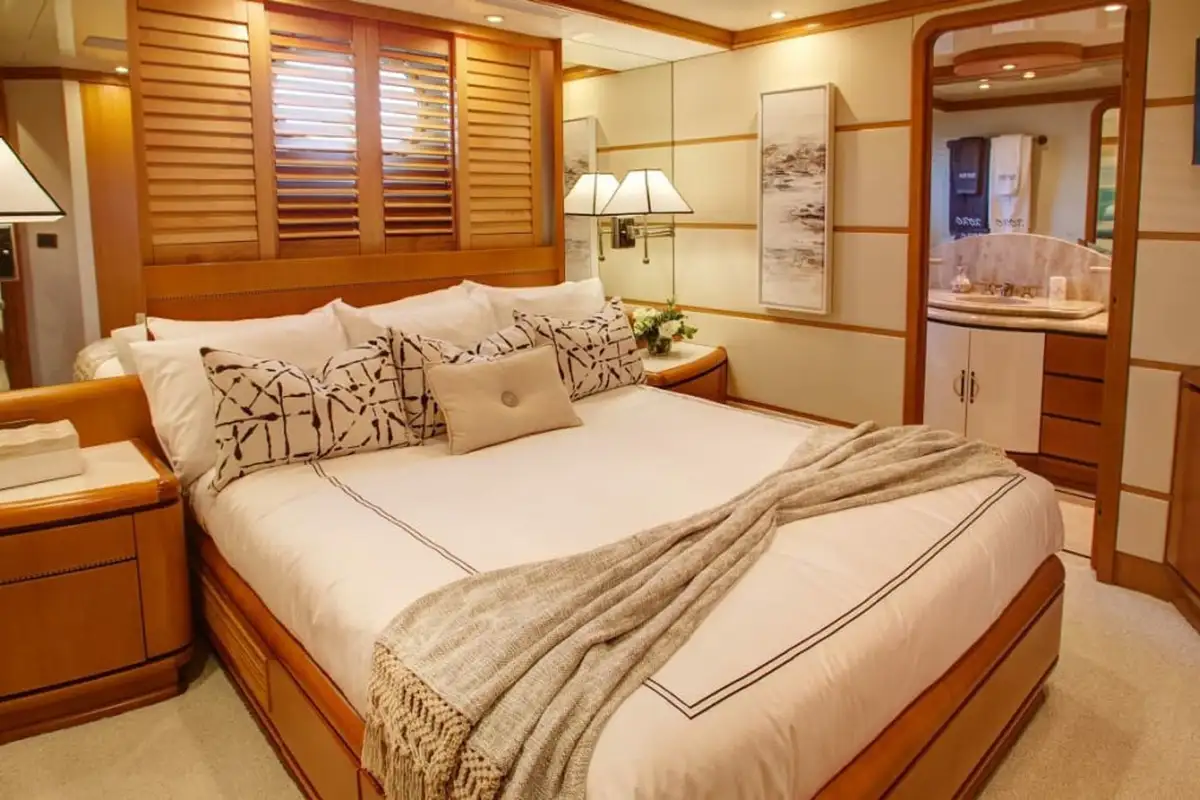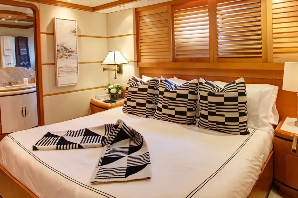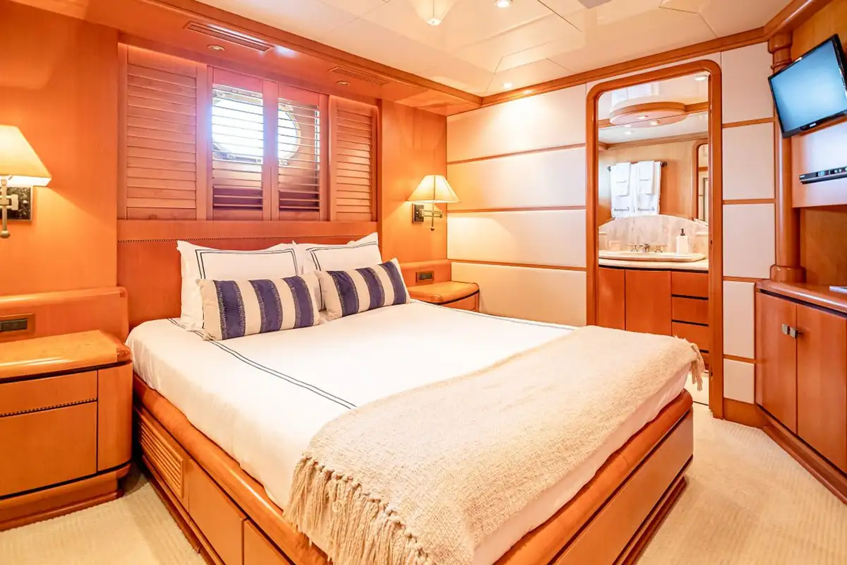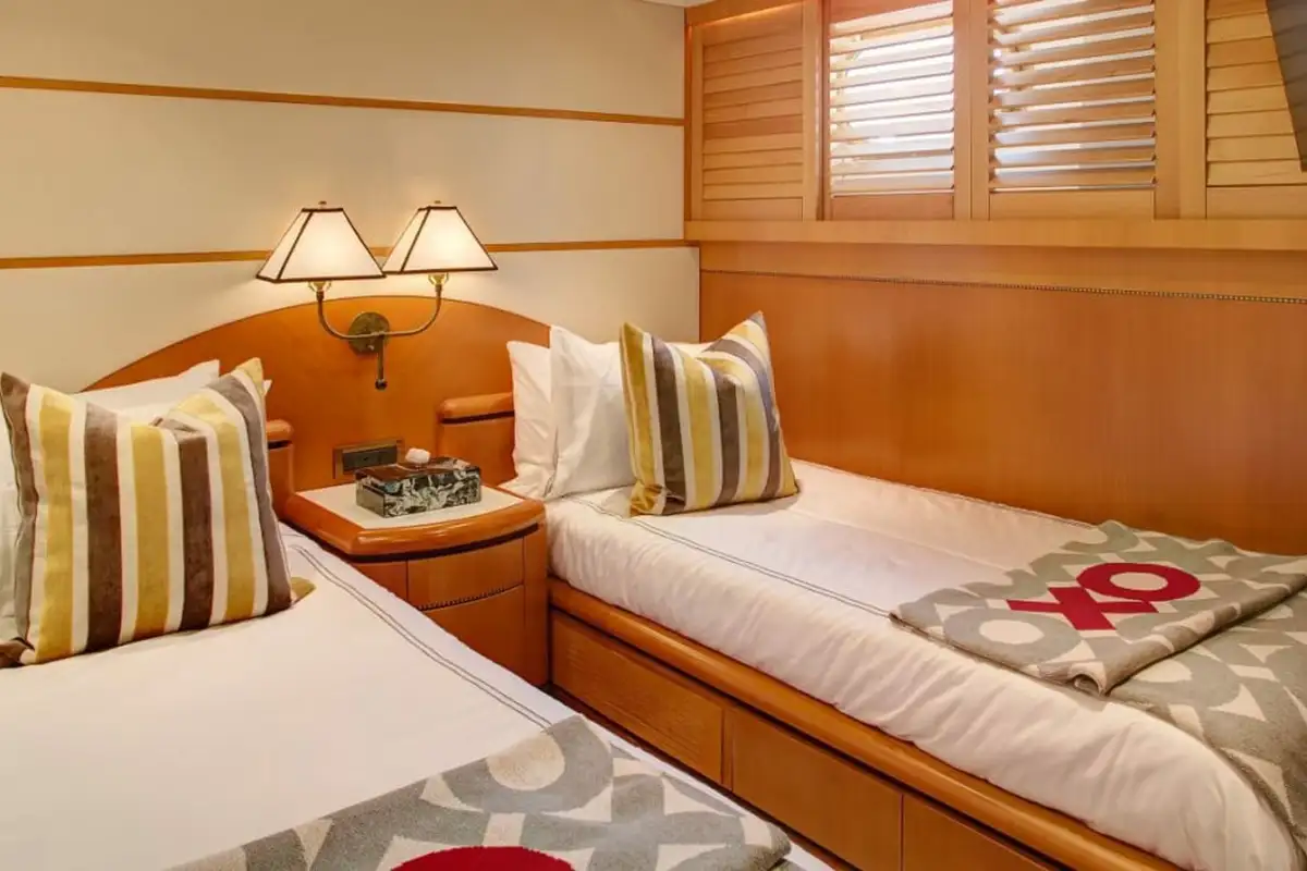 XOXO offers five beautiful cabins for up to 10 guests. Her full-beam master cabin, tucked away on the lower deck, featuring a king size bed and twin en suite bathrooms. Guest accommodations include a queen cabin, a convertible cabin and two convertible win cabins.