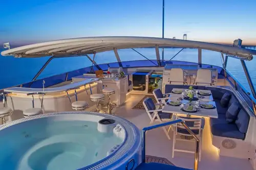 However, life aboard XOXO is meant to be lived in the open air. Her expansive sun deck is the heartbeat of the yacht, a space where mornings begin with coffee in the sun, afternoons melt into dips in the jacuzzi and evenings flow with cocktails from the bar before al fresco dinners under the stars.
