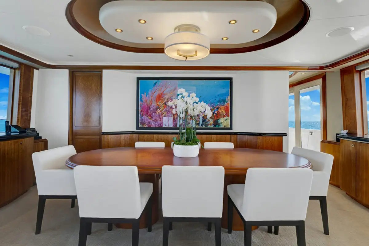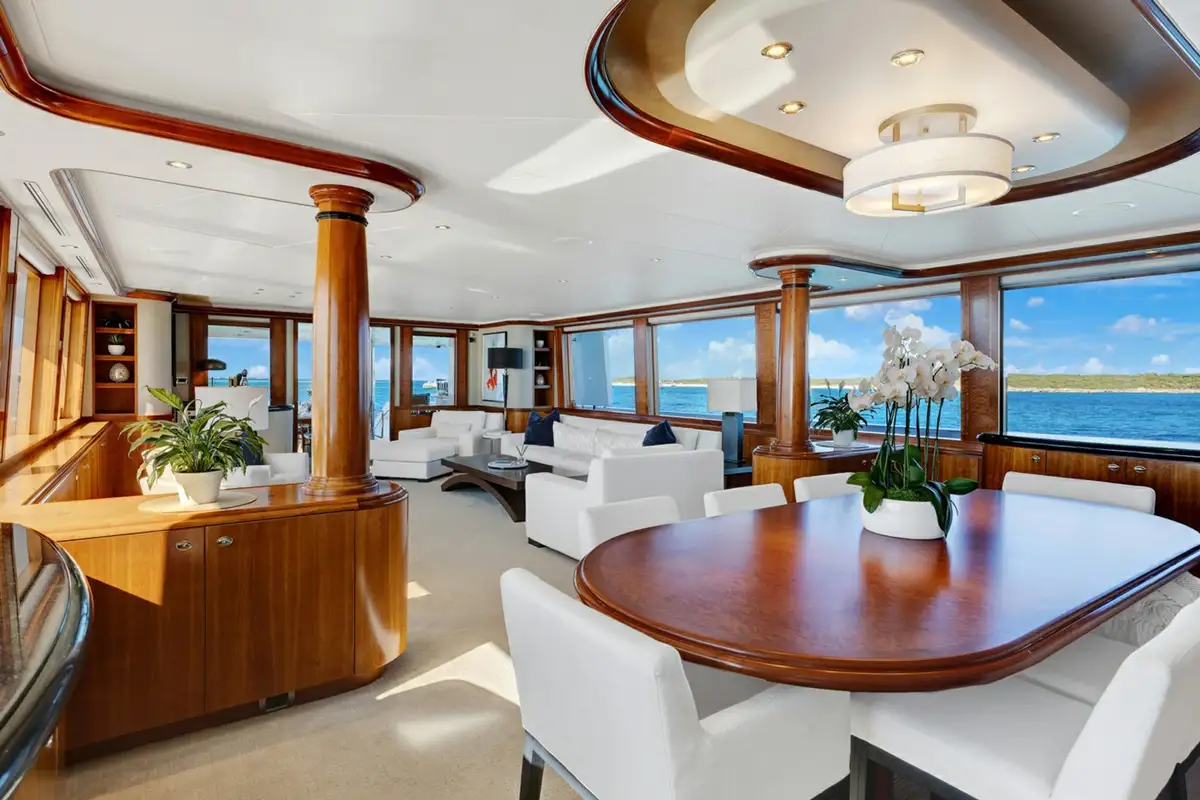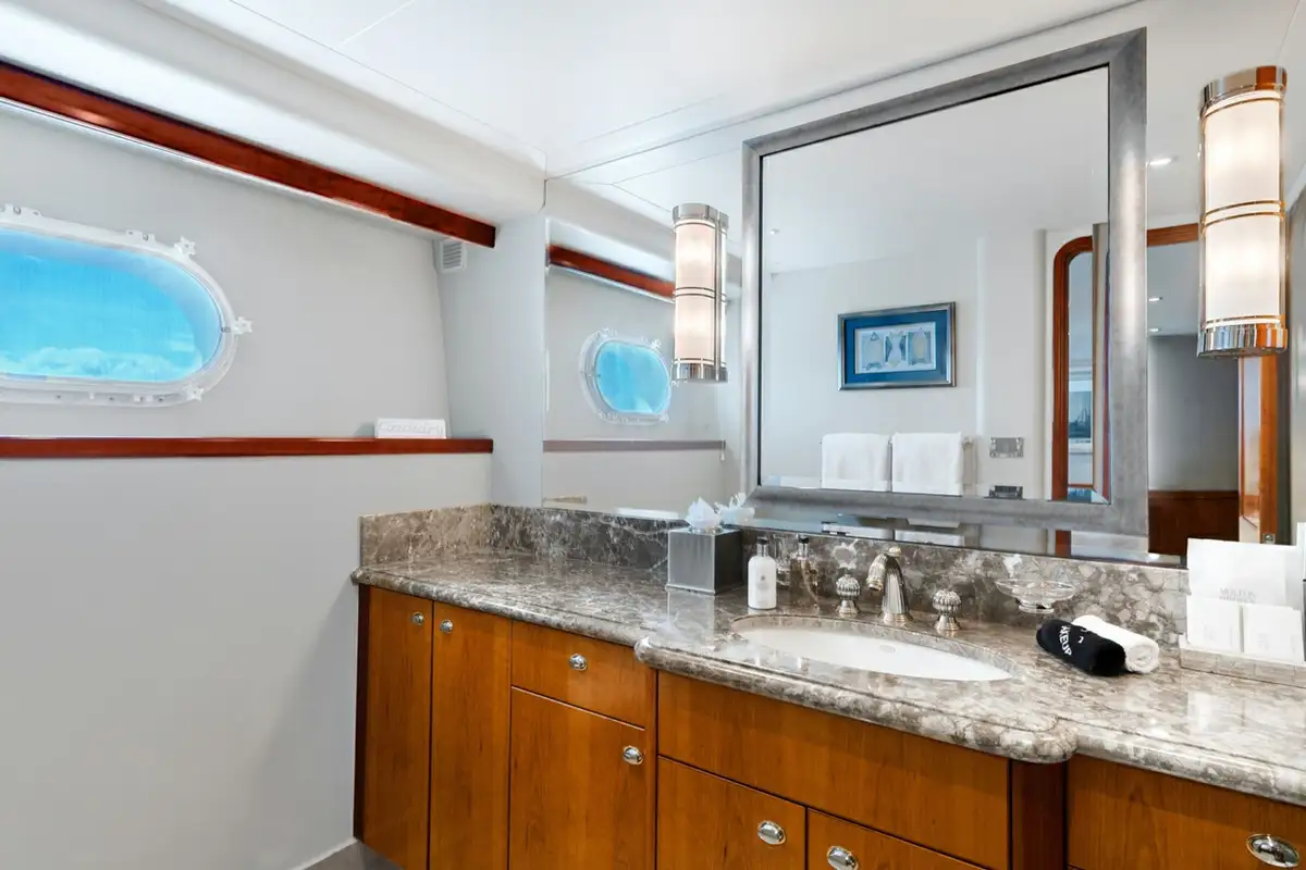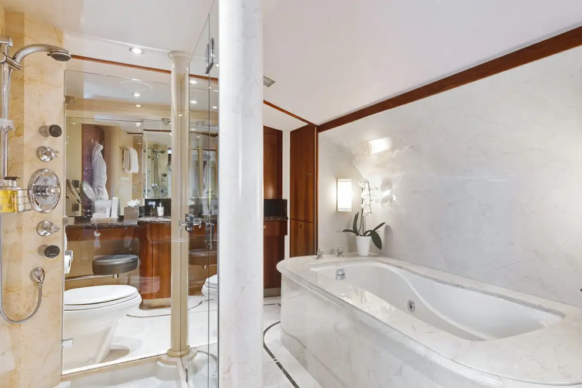 Up front on the main deck level, the master suite is the stand-out highlight of her accommodation. There’s a private office, a full-beam cabin and a marble-topped jacuzzi bathtub in the en suite bathroom. The other two doubles also have king size beds and there are two twin-bed cabins too, all of which have private en suite bathrooms.