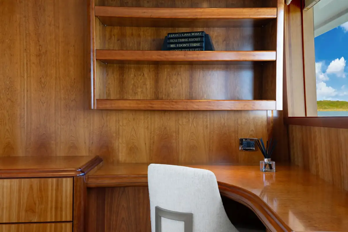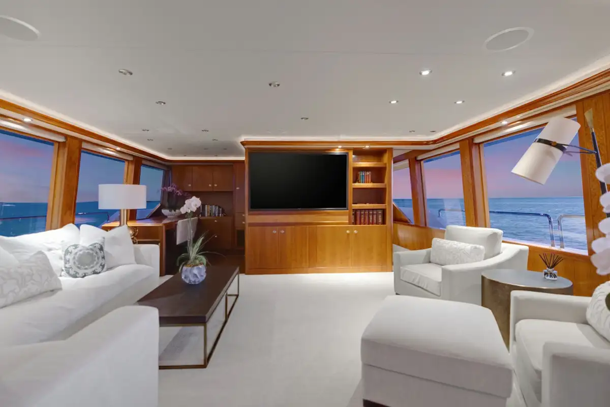 Her main deck lounge is cosy, spacious and bright. Spotless white upholstery and plush cream carpets offset the classic wood panelling. Big picture windows along the full length of the room deliver panoramic views and flood the whole space with natural light. The skylounge above it is a snug, sociable living room with the same finish and style, plus a big TV and a commanding view.