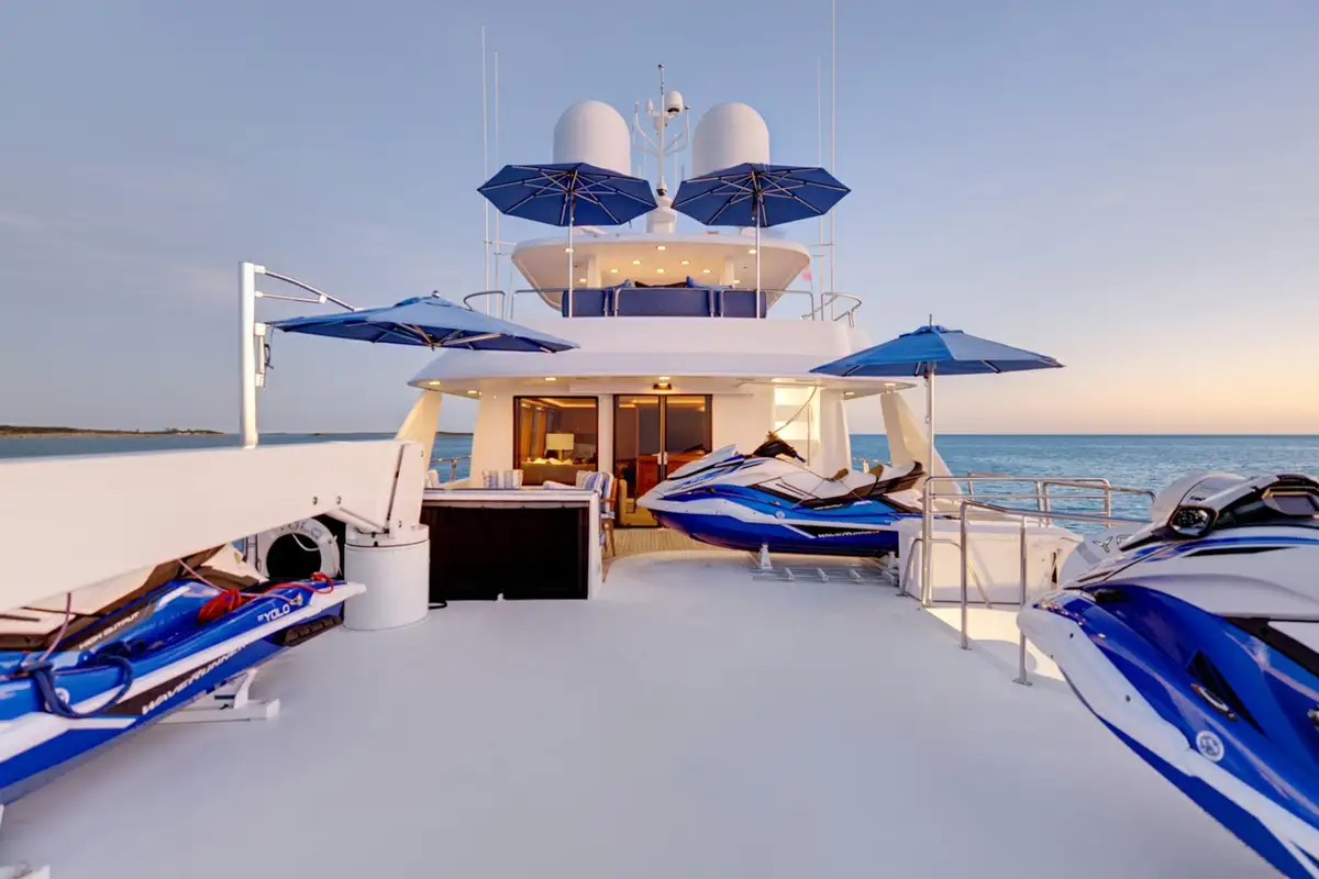 She’s well equipped for watersports with a fleet of toys that includes three-person Waverunners, waterskis for guests of all ages, SeaBob underwater scooters, kayaks and paddleboards, a giant water slide and more. With two tenders – a comfortable 39-footer and a jet-propelled RIB – some of your group can go ashore in grand style while the others zoom around the bay on wakeboards or inflatable tows.