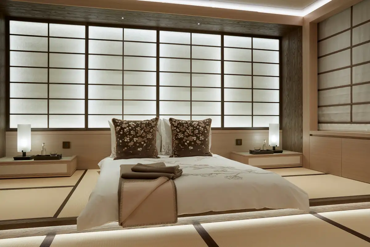 Your suite is a truly stunning space. From the forward-facing, king-sized bed, you'll enjoy breathtaking panoramic views, and the overhead skylight allows you to fall asleep beneath the stars. Your guests will be equally spoiled with a selection of beautifully designed suites, including an oriental-inspired suite featuring a low bed and traditional shoji screens.
