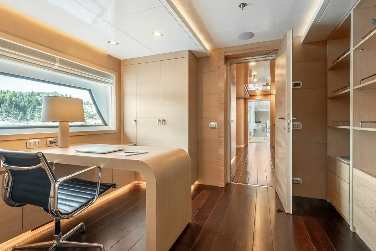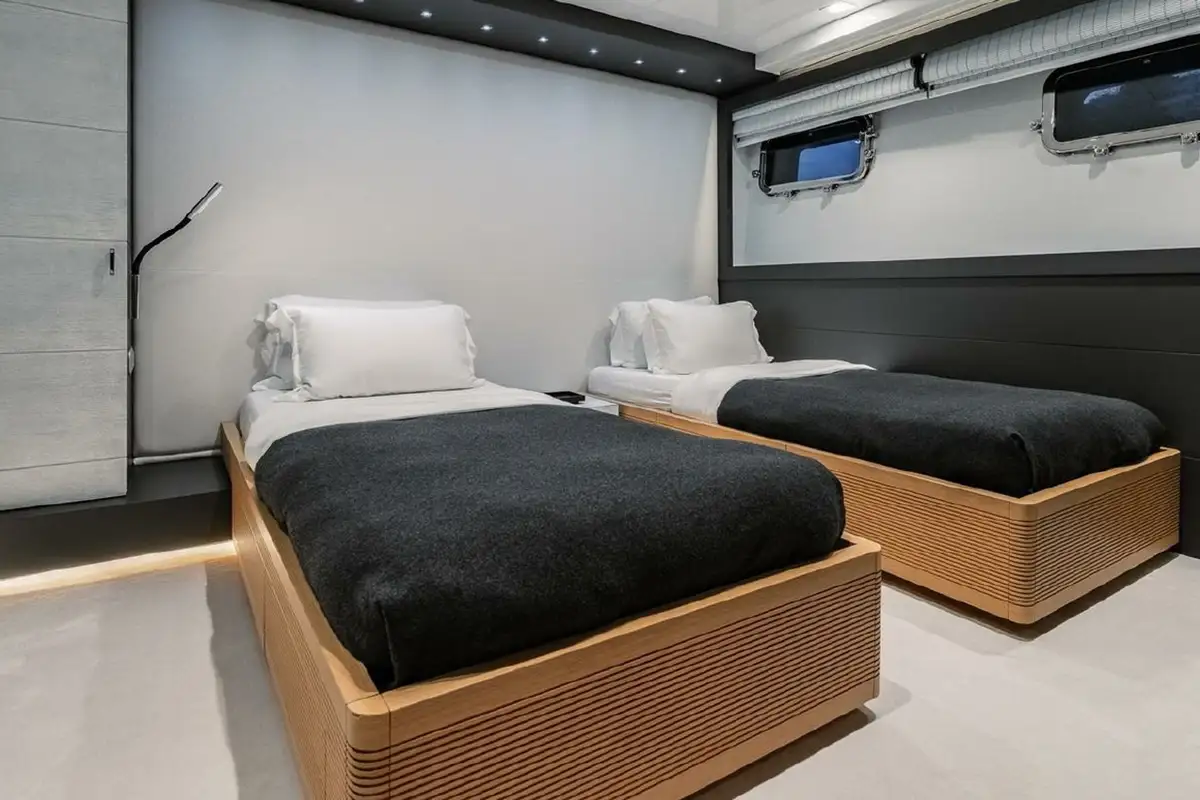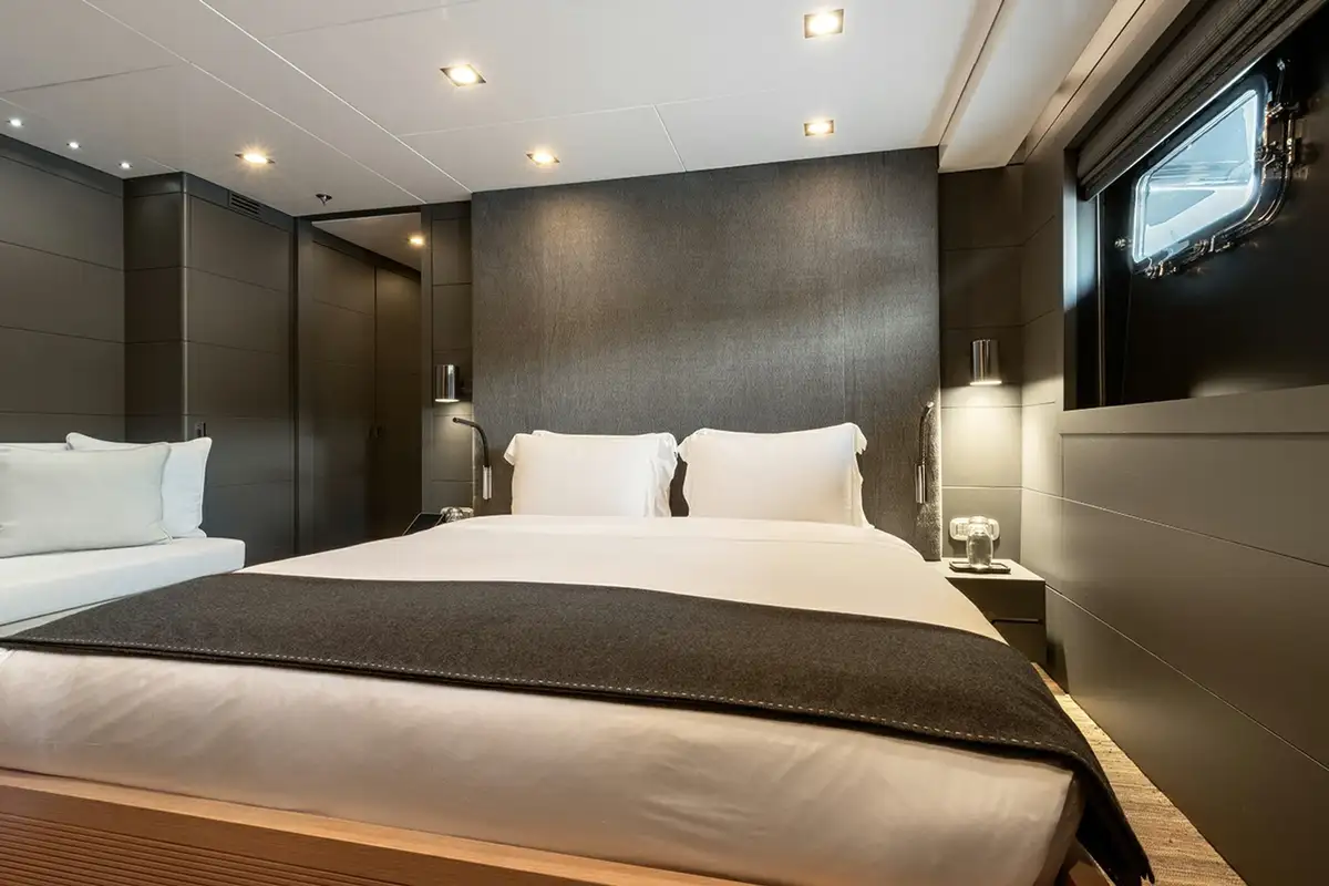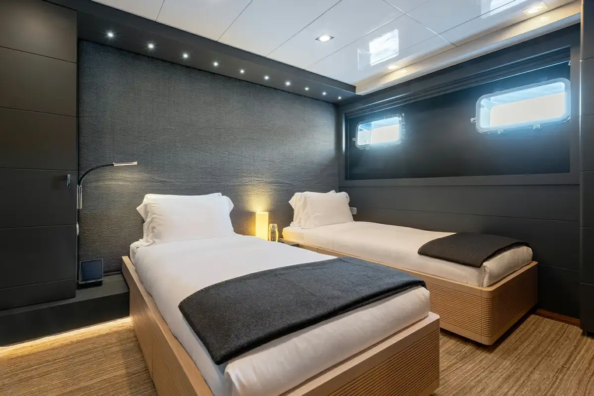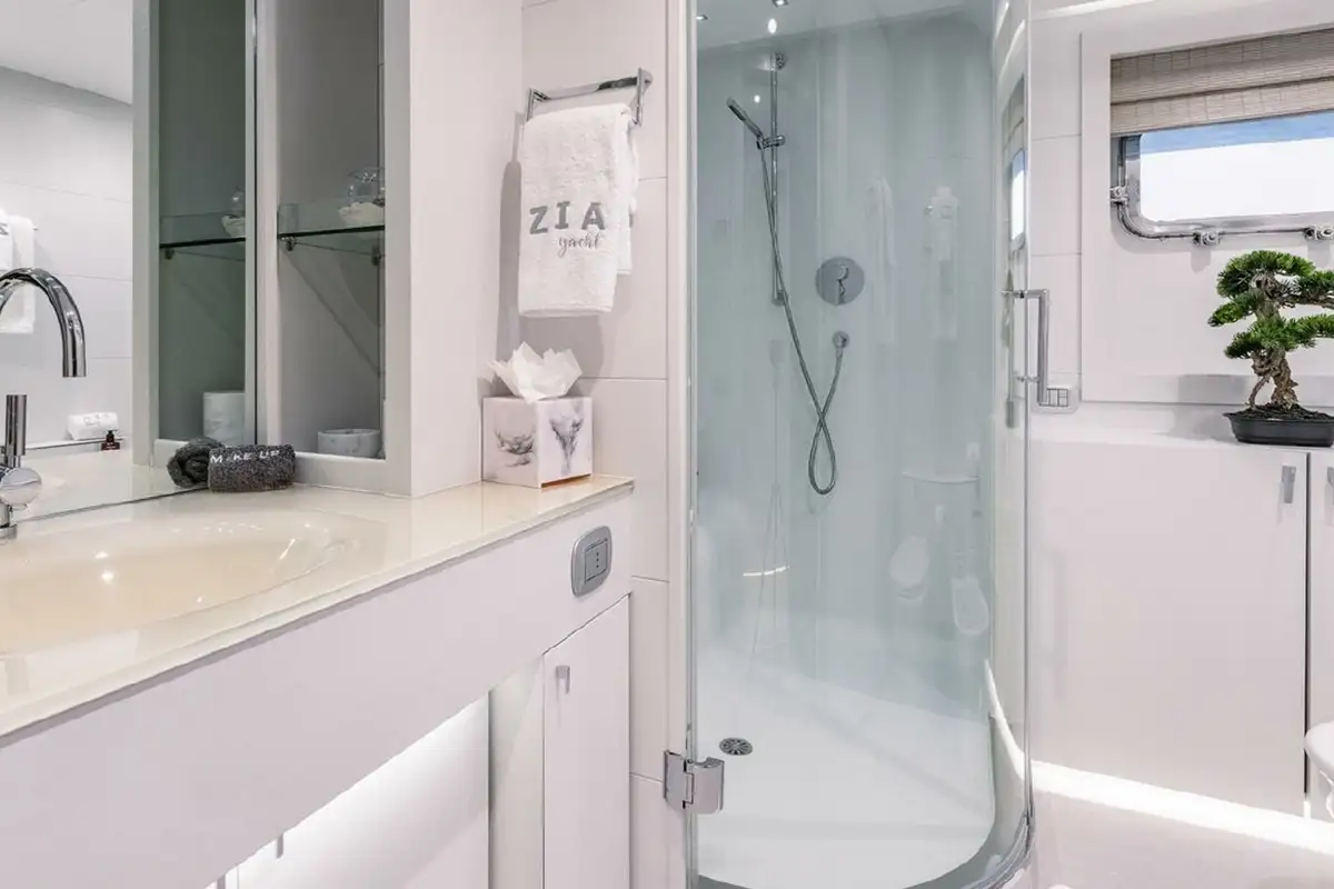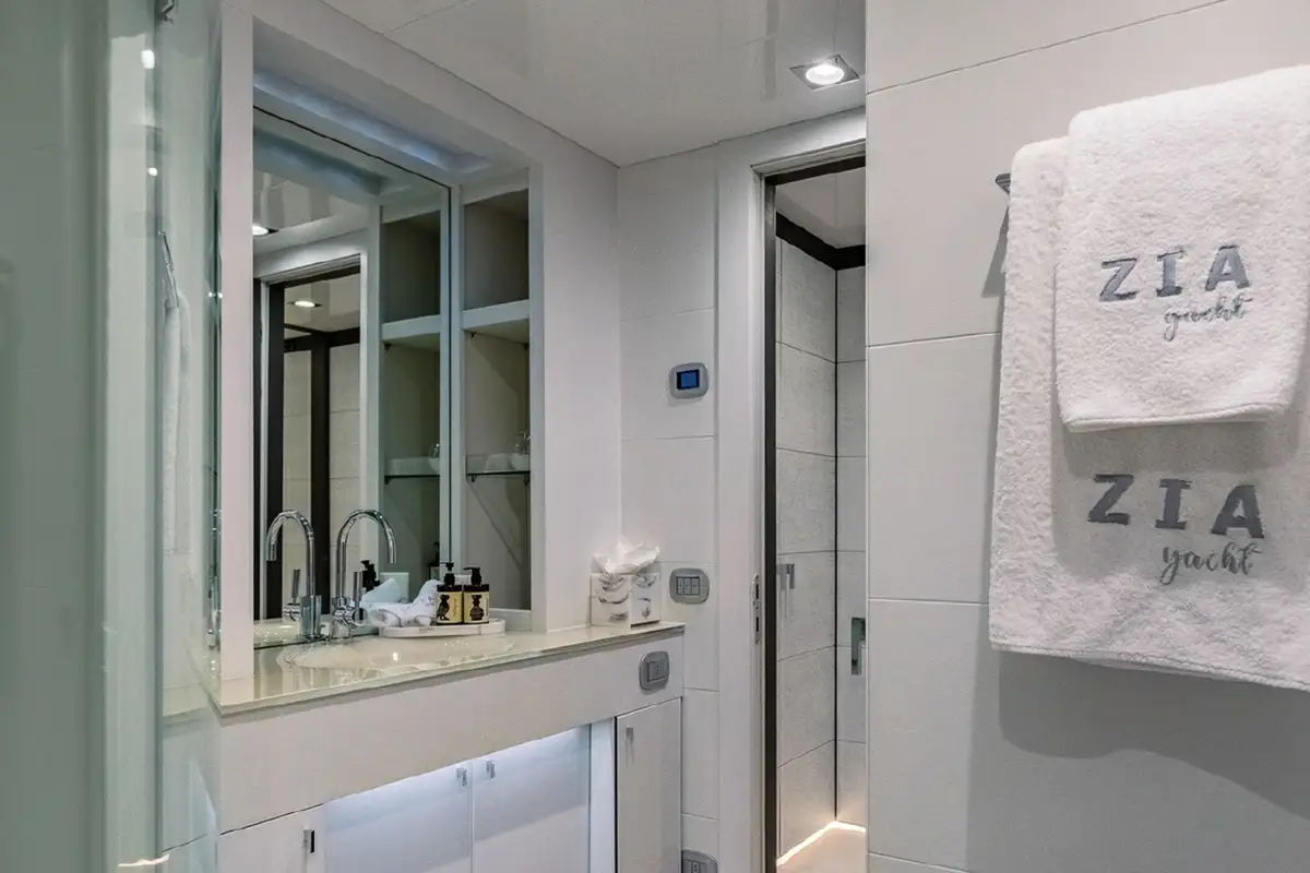 ZIA accommodates up to twelve guests in six beautifully appointed cabins. The full-beam master cabin is located on the main deck and features a private study, his-and-her bathrooms and a spa bath. A VIP cabin is situated on the upper deck, while the lower deck hosts two double cabins and two twin cabins—each convertible to doubles—providing maximum flexibility for family and friends.