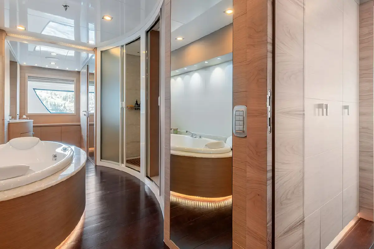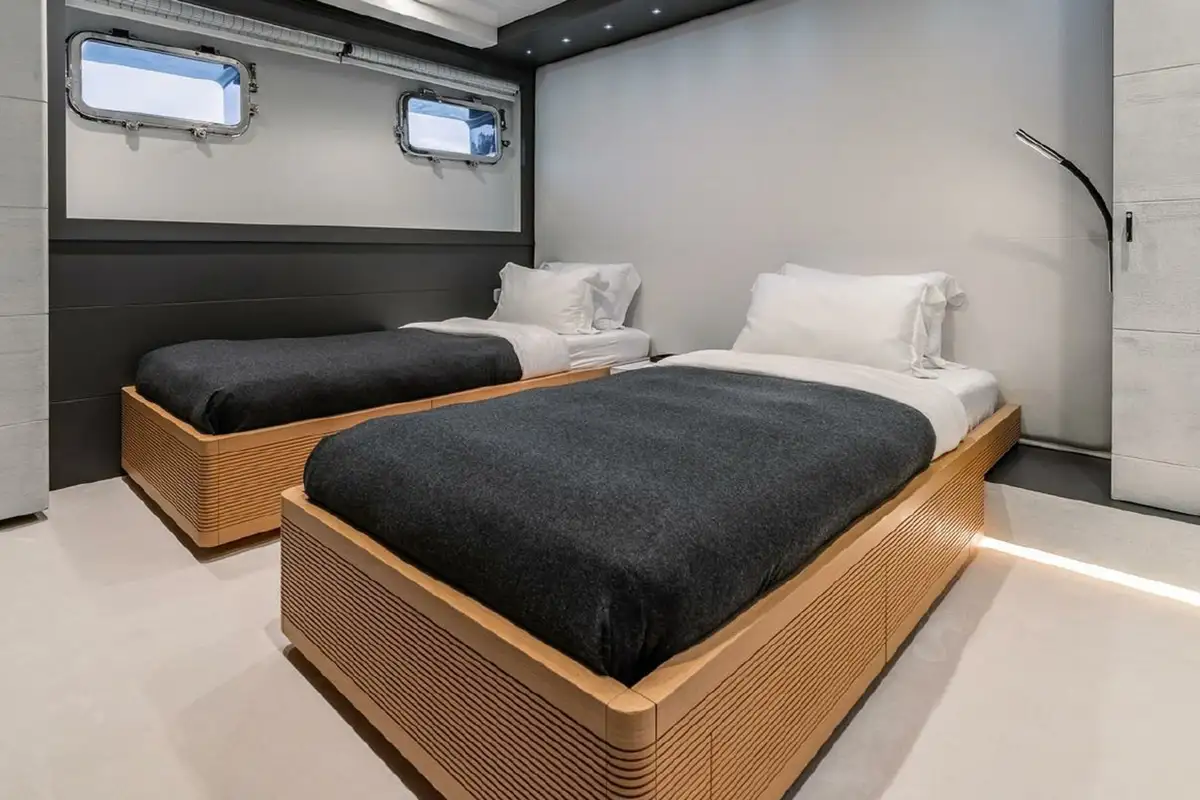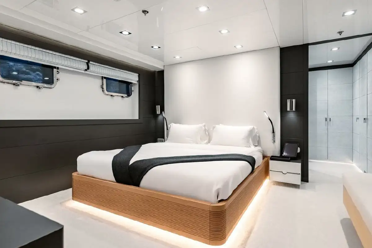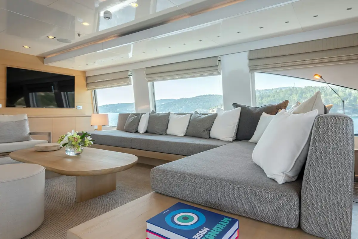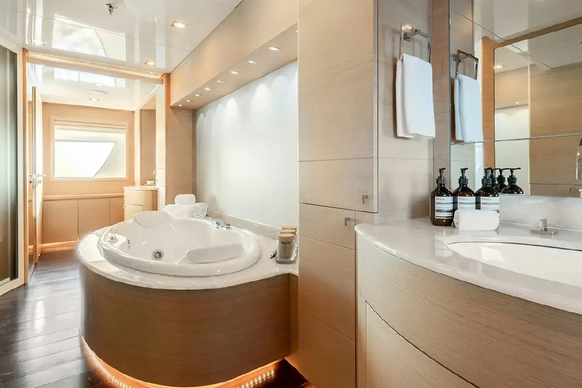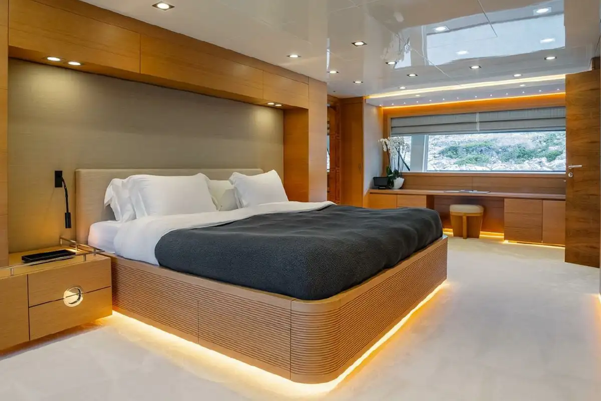 ZIA accommodates up to twelve guests in six beautifully appointed cabins. The full-beam master cabin is located on the main deck and features a private study, his-and-her bathrooms and a spa bath. A VIP cabin is situated on the upper deck, while the lower deck hosts two double cabins and two twin cabins—each convertible to doubles—providing maximum flexibility for family and friends.
