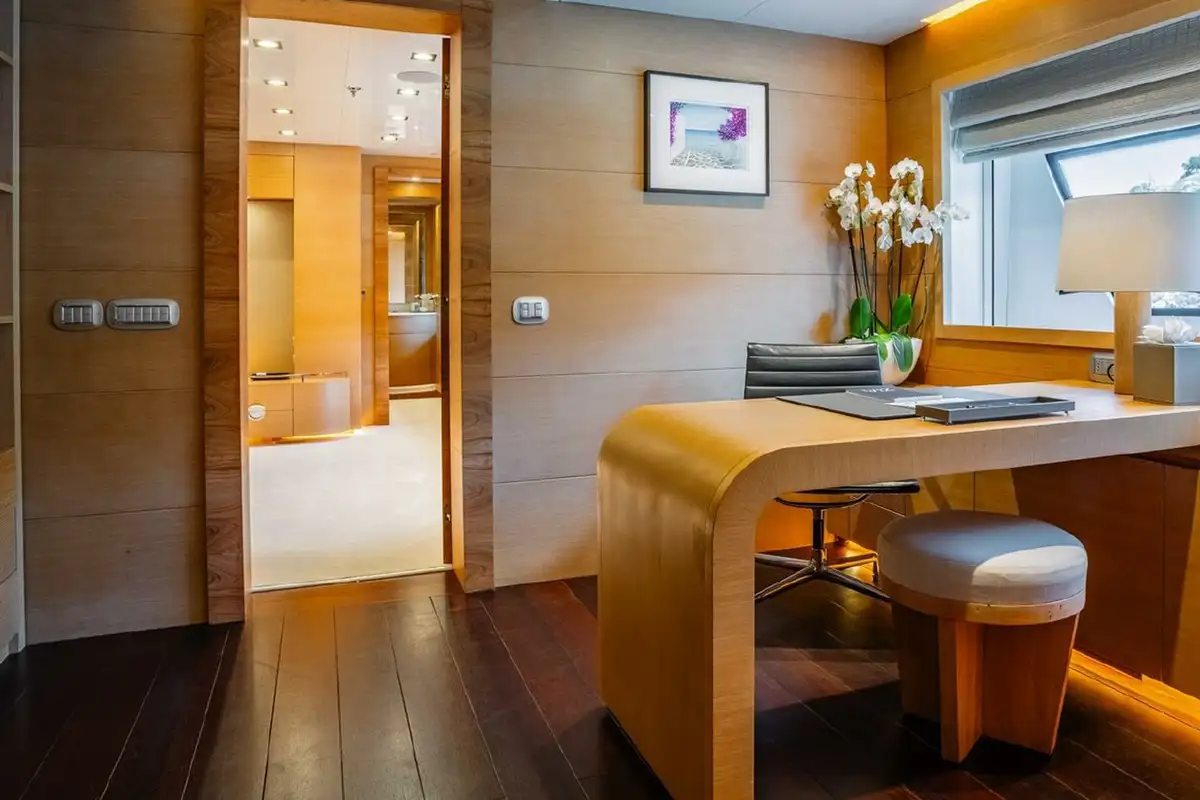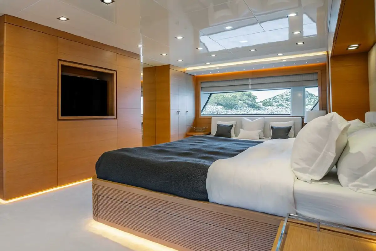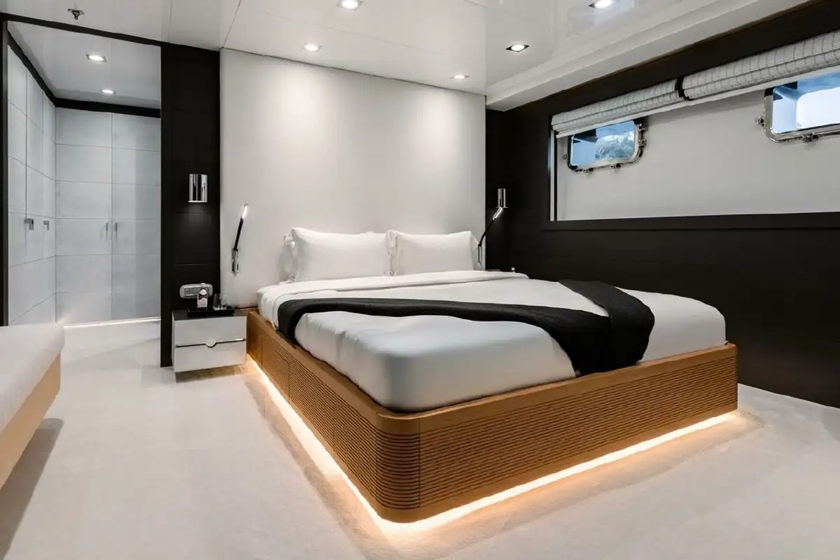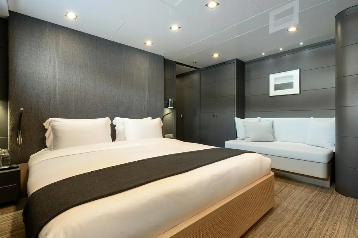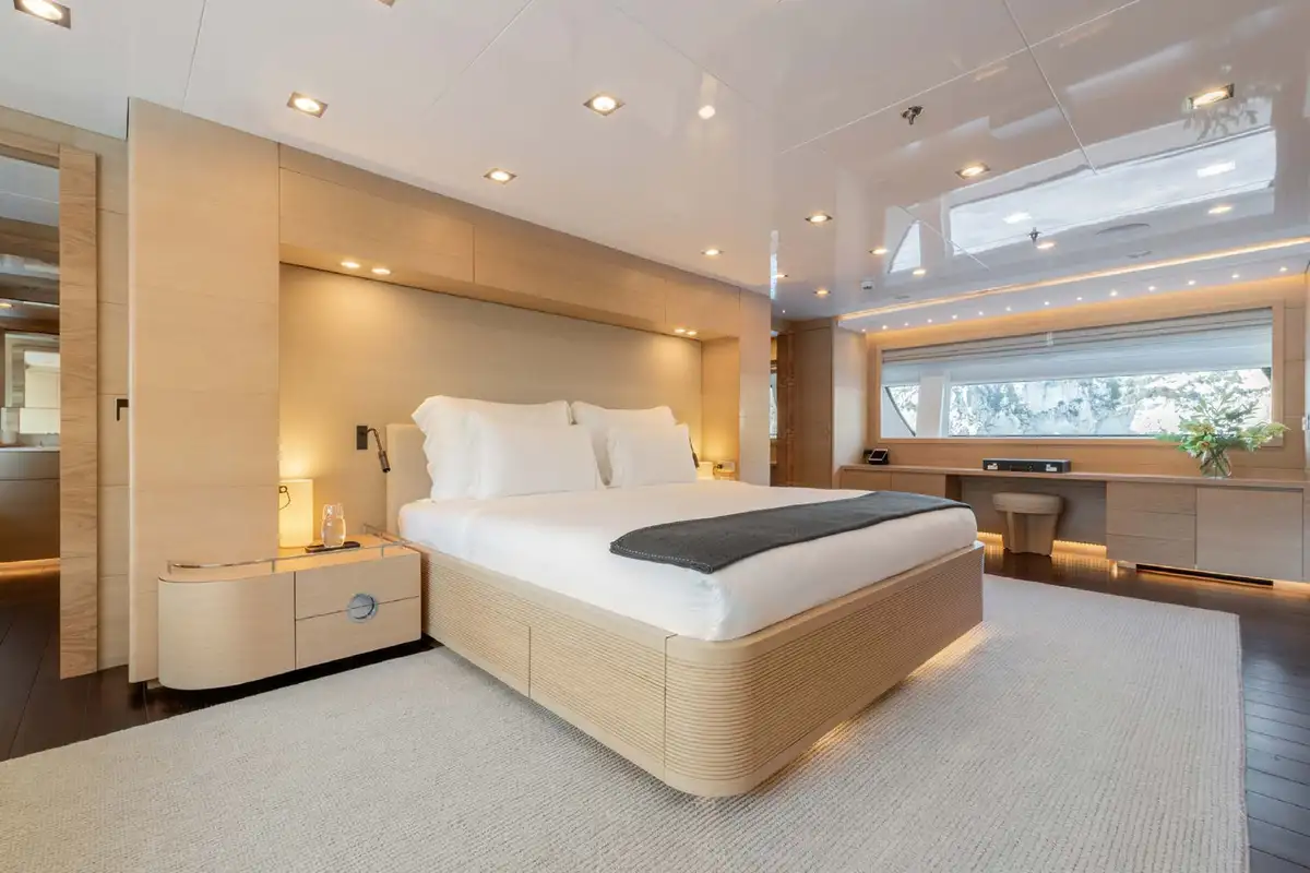 ZIA accommodates up to twelve guests in six beautifully appointed cabins. The full-beam master cabin is located on the main deck and features a private study, his-and-her bathrooms and a spa bath. A VIP cabin is situated on the upper deck, while the lower deck hosts two double cabins and two twin cabins—each convertible to doubles—providing maximum flexibility for family and friends.