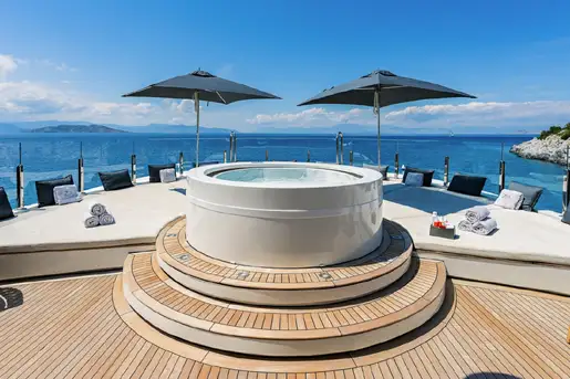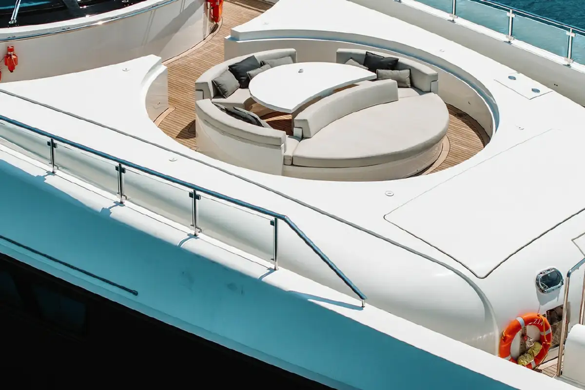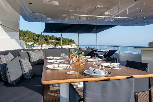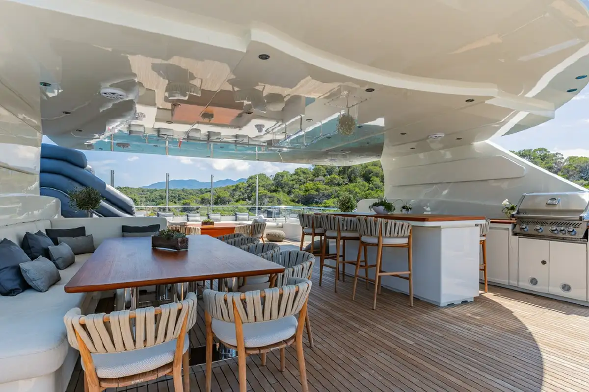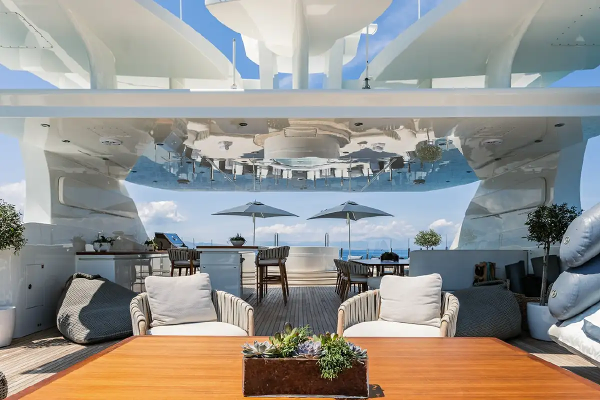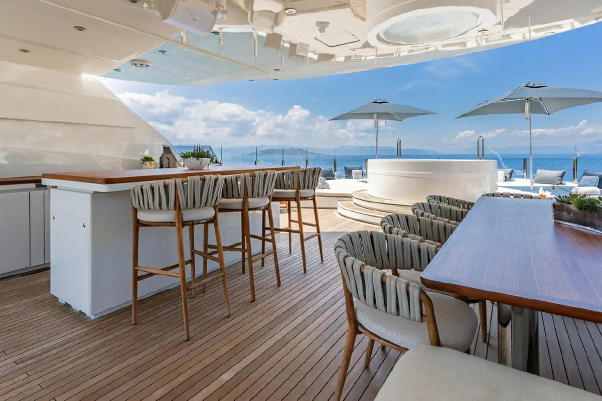 Outdoor living is a defining feature aboard ZIA. The expansive sun deck invites long, lazy afternoons with a Jacuzzi, sun pads, a fully equipped bar and a shaded al fresco dining area, all overlooking endless seascapes. The upper deck aft offers a more private setting for sunset aperitifs or post-dinner conversations, while the beach club provides seamless access to the sea for both relaxation and adventure.