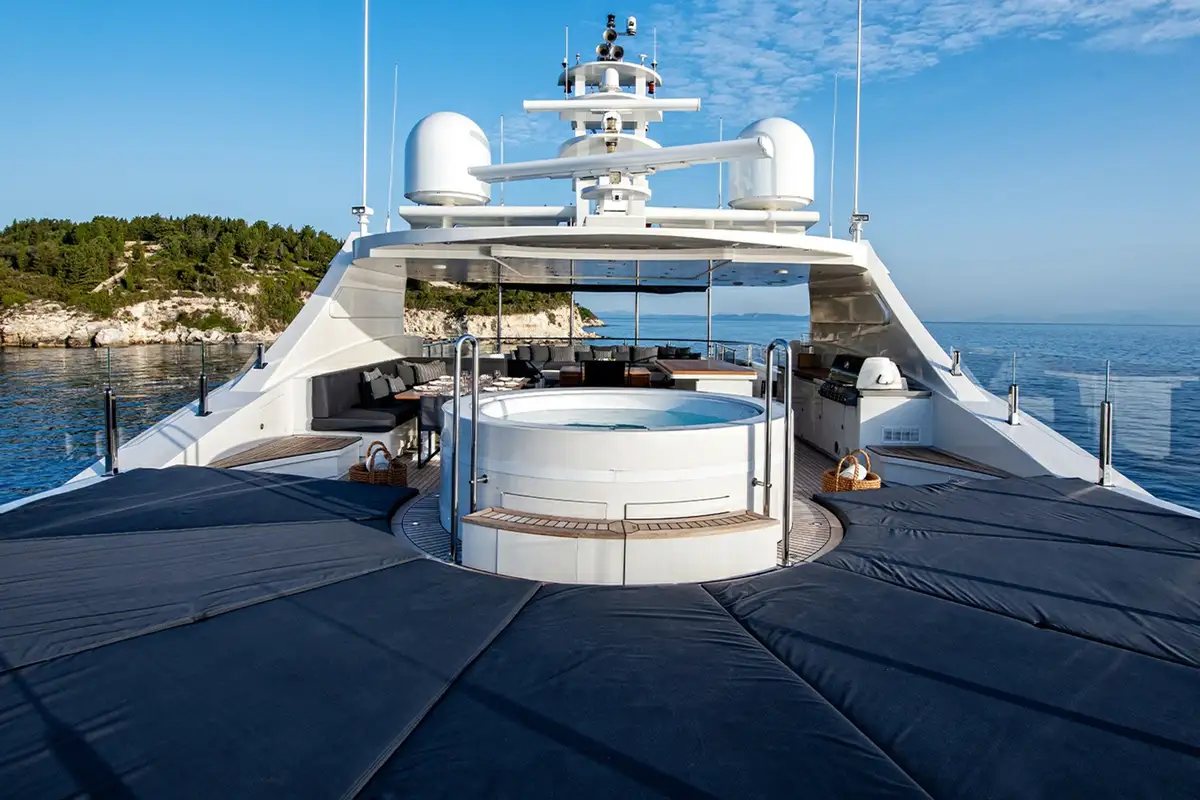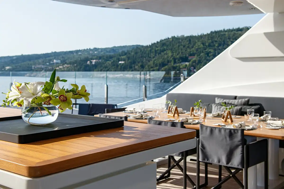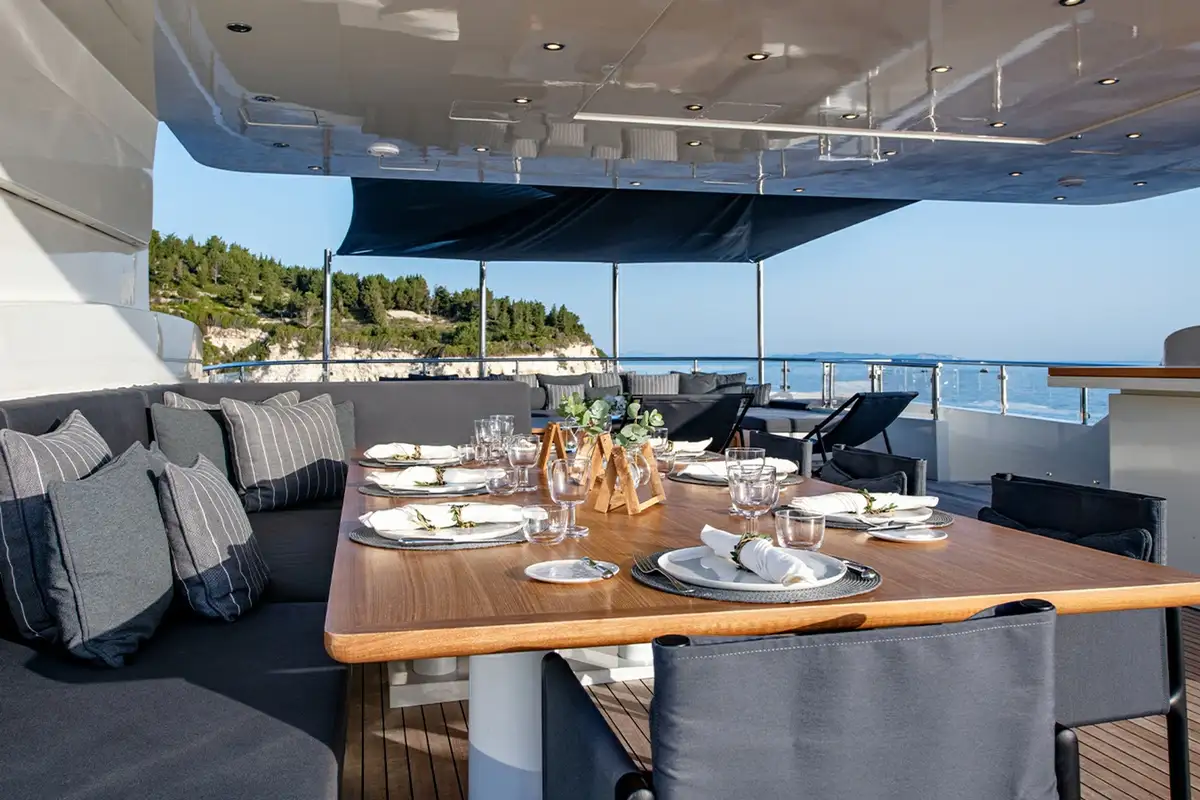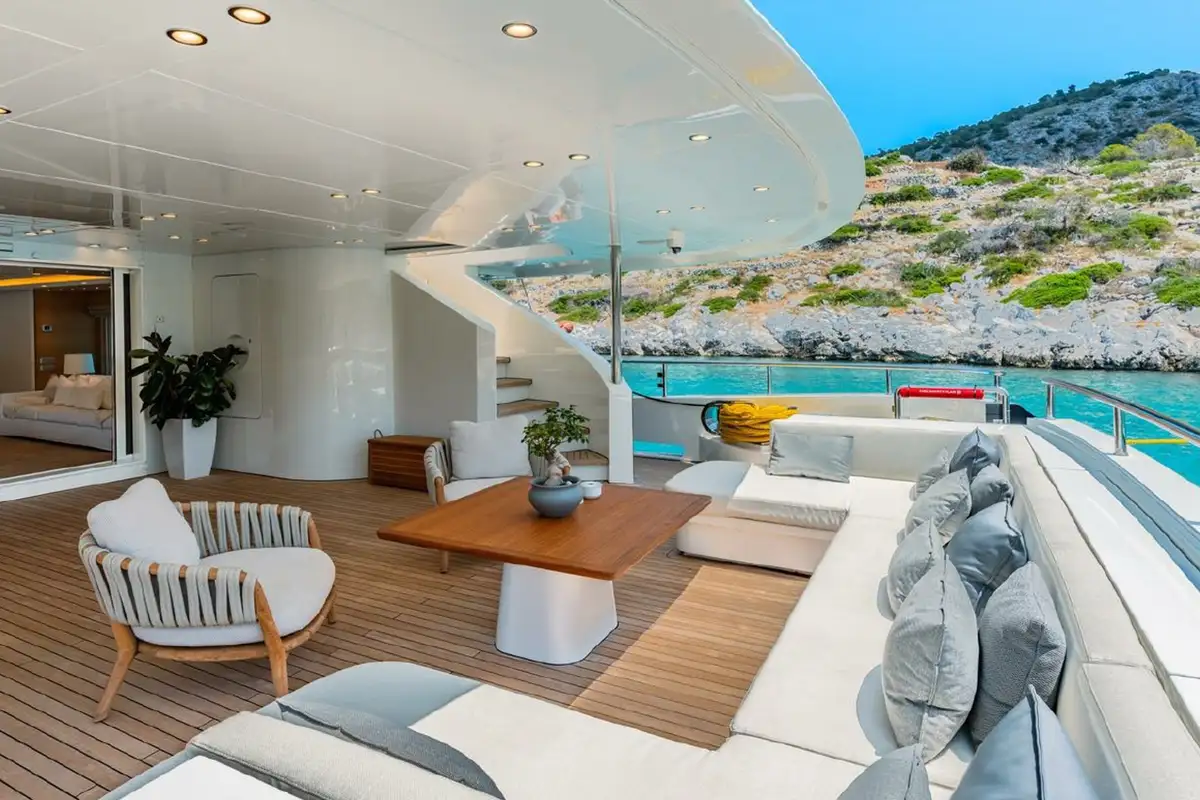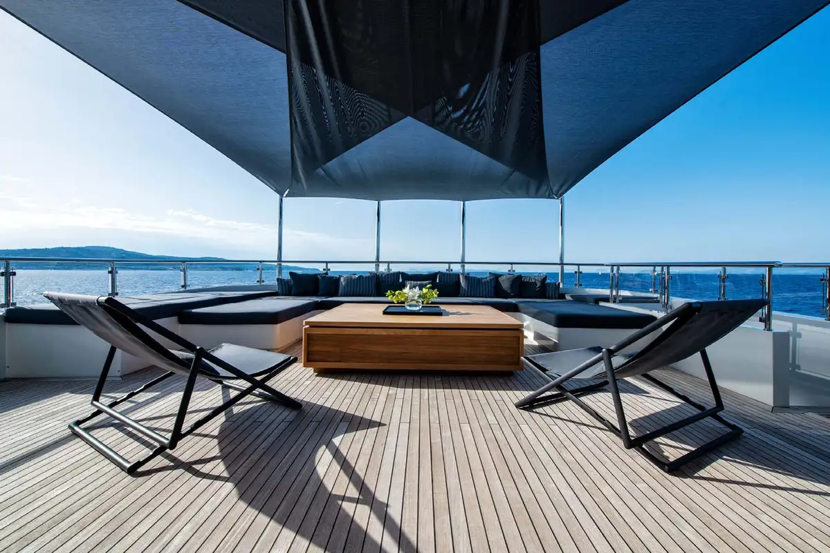 Outdoor living is a defining feature aboard ZIA. The expansive sun deck invites long, lazy afternoons with a Jacuzzi, sun pads, a fully equipped bar and a shaded al fresco dining area, all overlooking endless seascapes. The upper deck aft offers a more private setting for sunset aperitifs or post-dinner conversations, while the beach club provides seamless access to the sea for both relaxation and adventure.