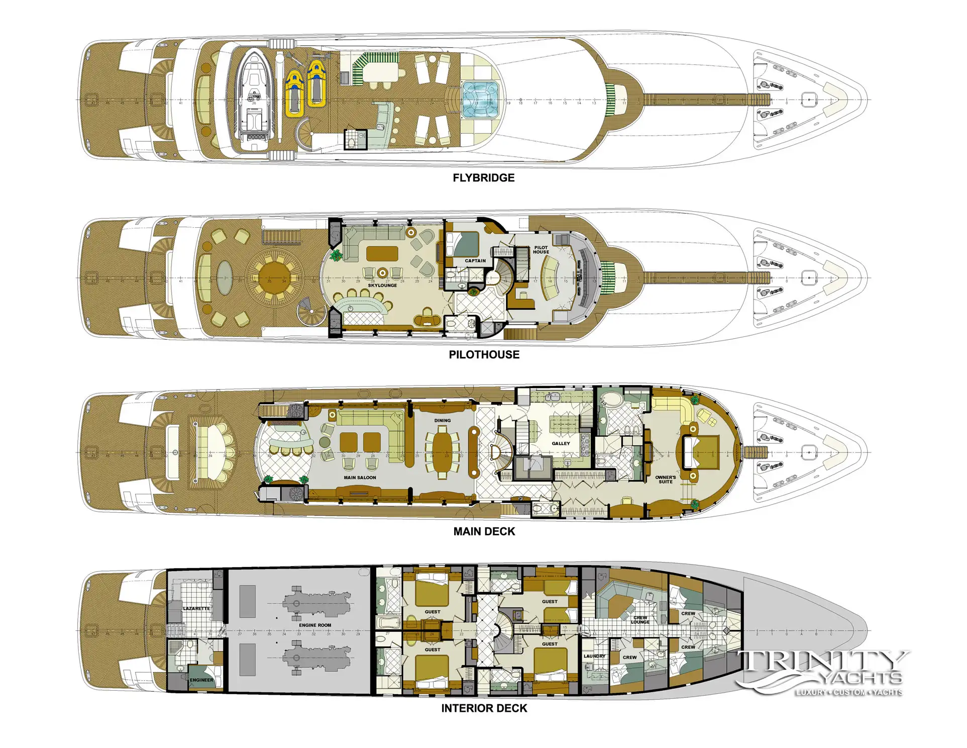 - Main deck split-level master cabin, with 180-degree wrap around view