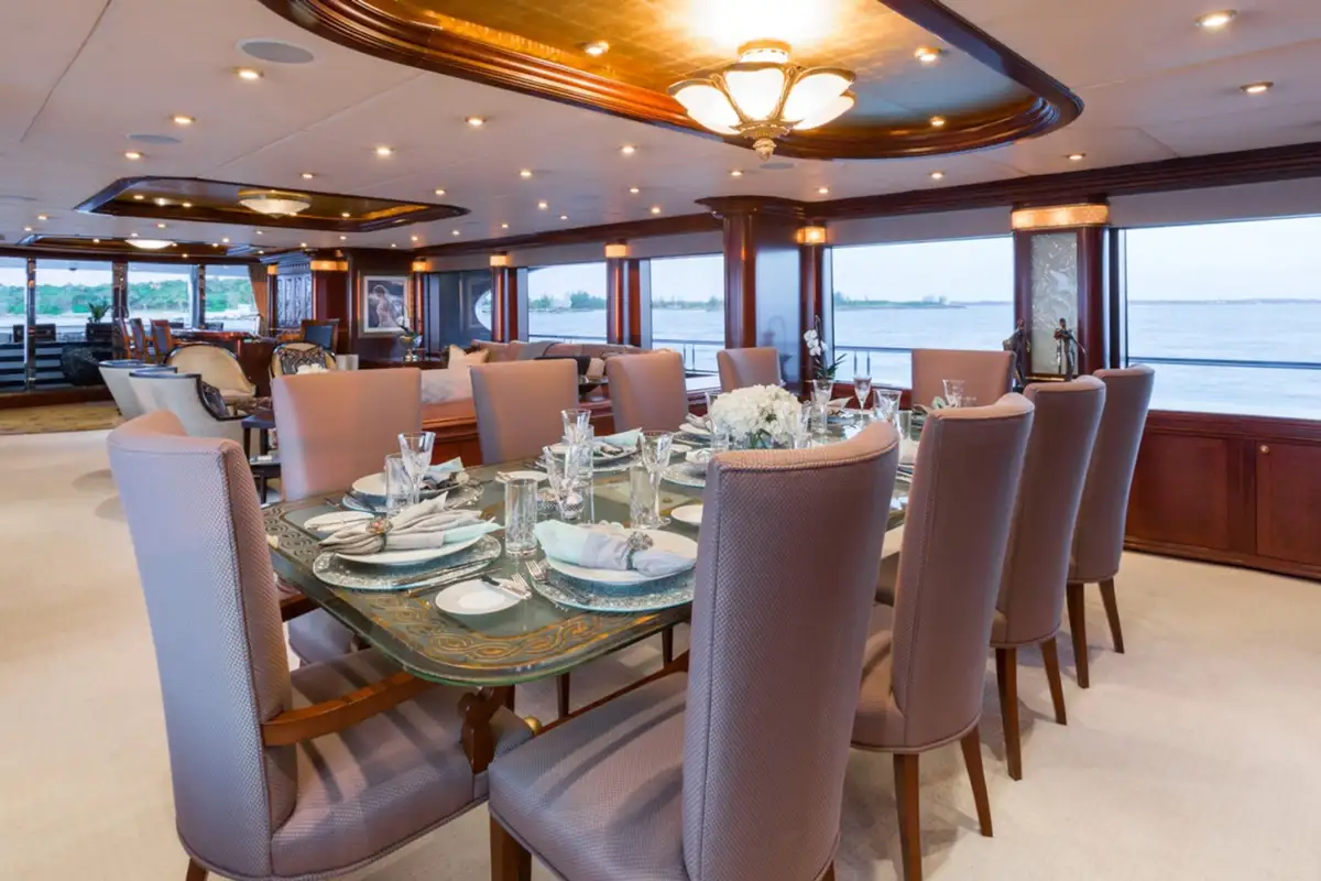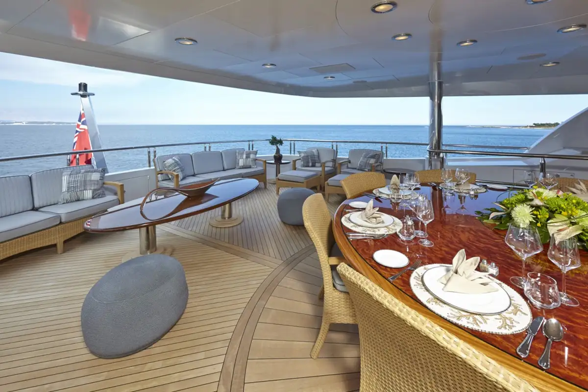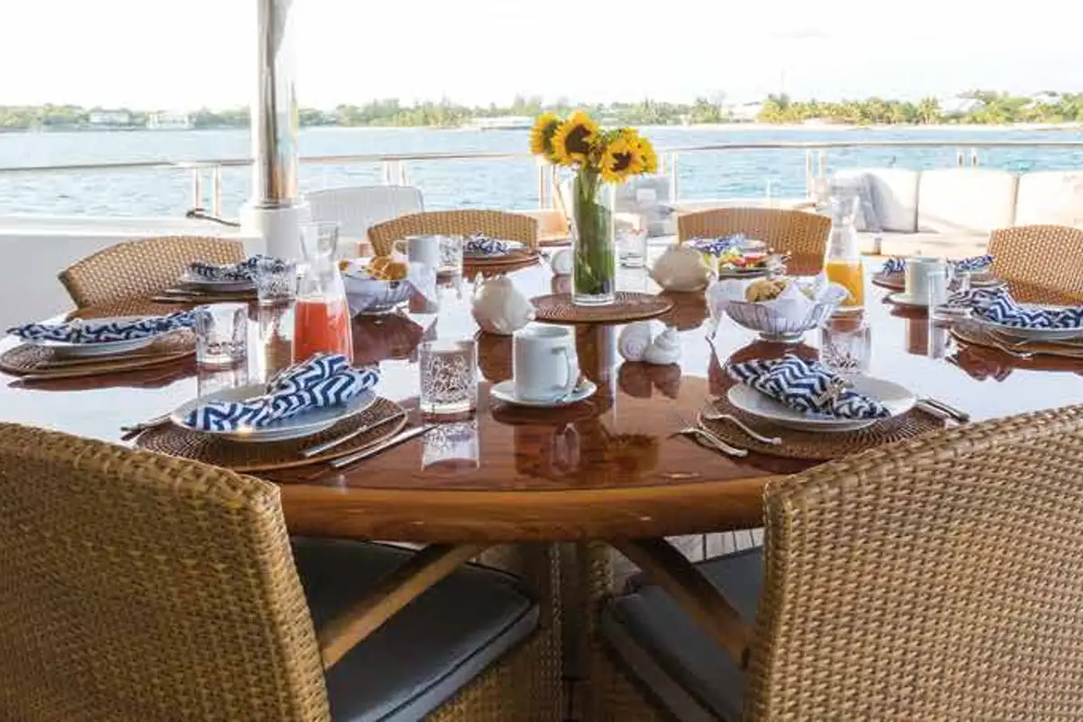 Come sundown the glamorous main deck lounge and sit-up bar is the place to congregate for a cocktail. Dress for dinner and fine dine in the saloon or take an informal approach with a relaxed meal al fresco at one of the three outdoor tables.