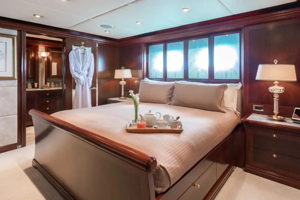 Open your eyes to a view you’ll always remember from the king sized bed in the master suite. It is raised in this split level cabin to afford you 180 degree views of the anchorage from your pillows. Step down to one of your two en suites, and pick something light from your walk in wardrobe, before heading out to the main aft deck for a relaxed breakfast.