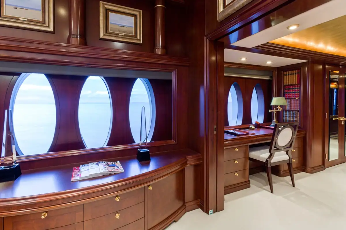 The yacht has zero speed stabilisers to ensure that everyone is feeling well rested as they emerge from one of the four chic cabins on the lower deck. Accessed via a grand central staircase, the three double cabins and one twin radiate off a central lobby. Each has dark wood panelling and French bateau-style beds, with marble en suites.