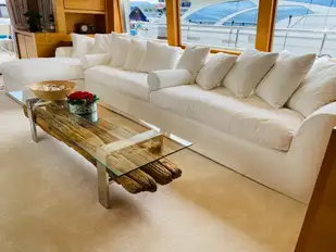 Large picture windows flood the main deck lounge with natural light, illuminating light woods and cream leather L-shaped seating to create a bright, airy ambience. A formal dining room forward seats all guests in comfort, and the tabletop can fold away to transform the space into an open, multi-purpose area when not in use.