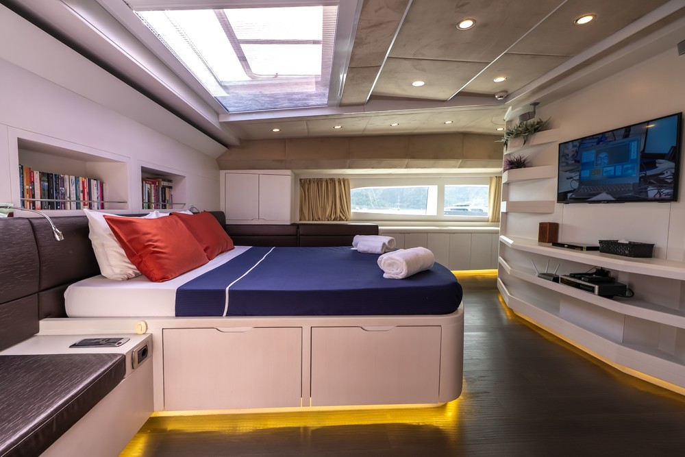 JAFE TICA has comfortable accommodation for up to 12 guests across five cabins, including a full beam master on the main deck. Excellent guest spaces include a spacious flybridge with jacuzzi and cosy sun pads, and a generous al fresco dining area on the main deck aft.