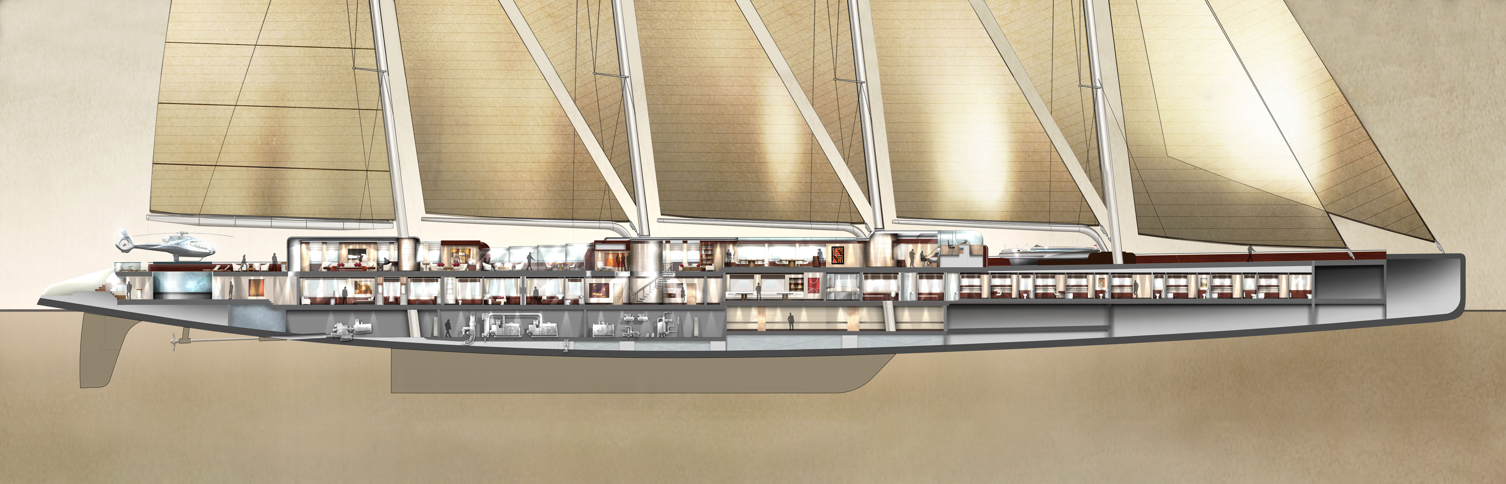 Externally she is characterised by delicious soft curves, from the hull-deck joint to the modular superstructure, both featuring an abundance of glass. Above, four masts, towering 70m (229.7ft) above the water carry furling staysails on Hoyt booms for ease of handling, totalling 5,080sqm (54,680sqft) of sail area. In flat calms she has a high tech diesel electric propulsion system giving her a maximum range under power of 5,900nm.